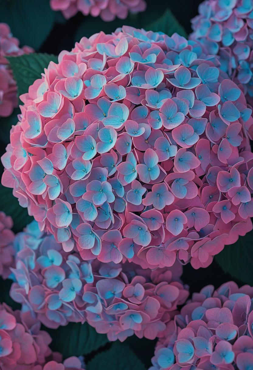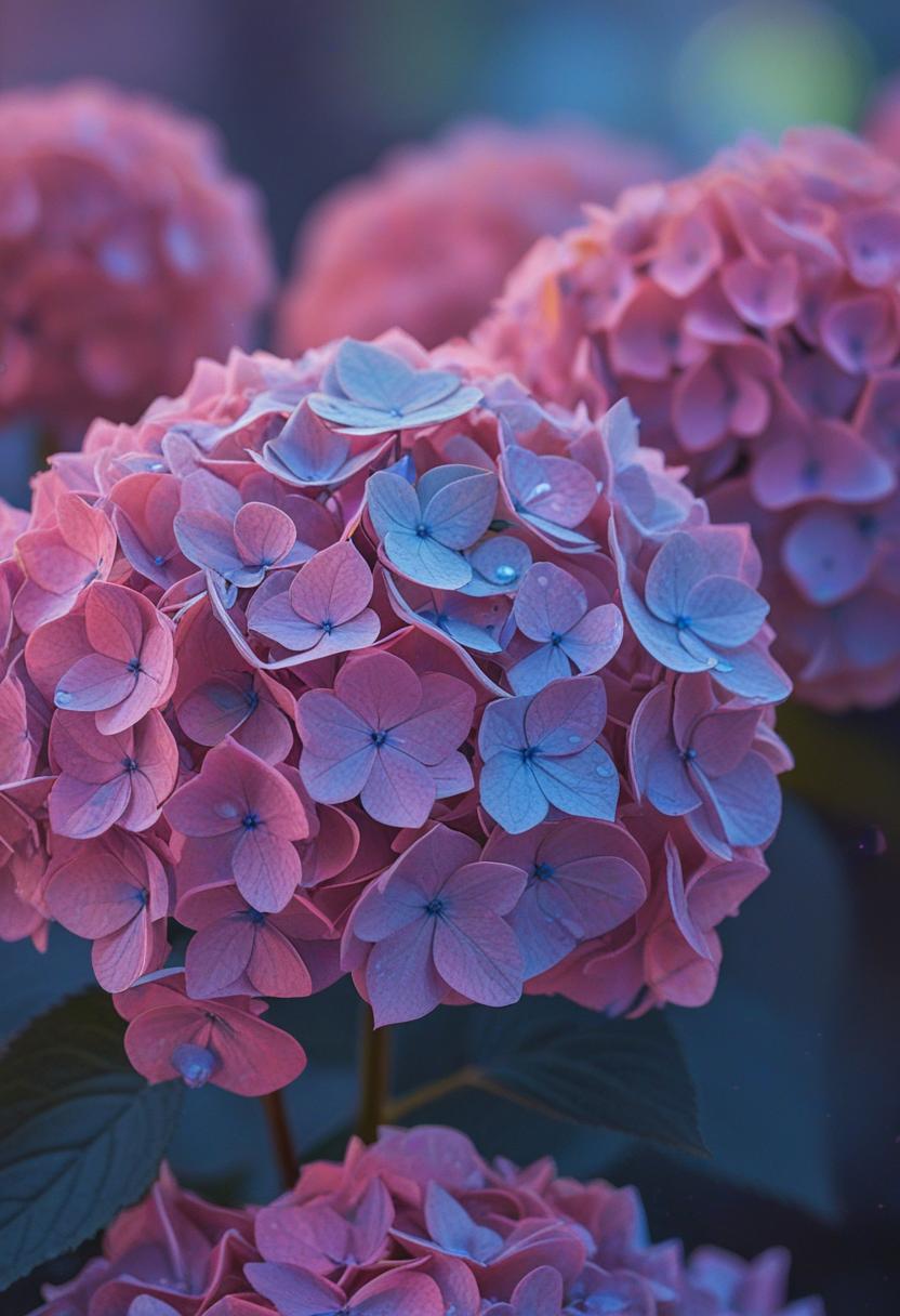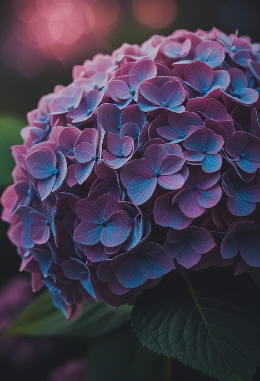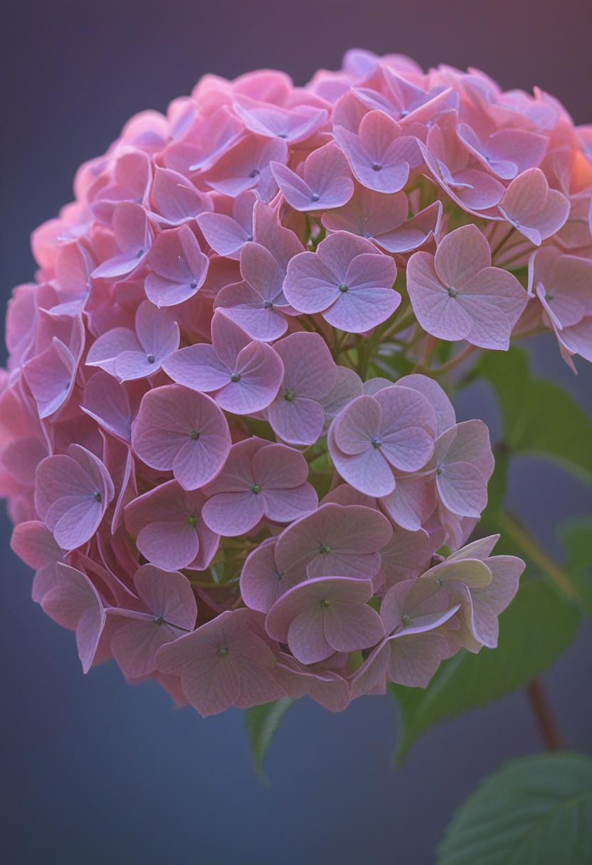11. A midshot of a hydrangea under a vibrant sunset, blending soft pink and purple hues, creating a dreamy, fantasy-like atmosphere with a calming, aesthetic glow.