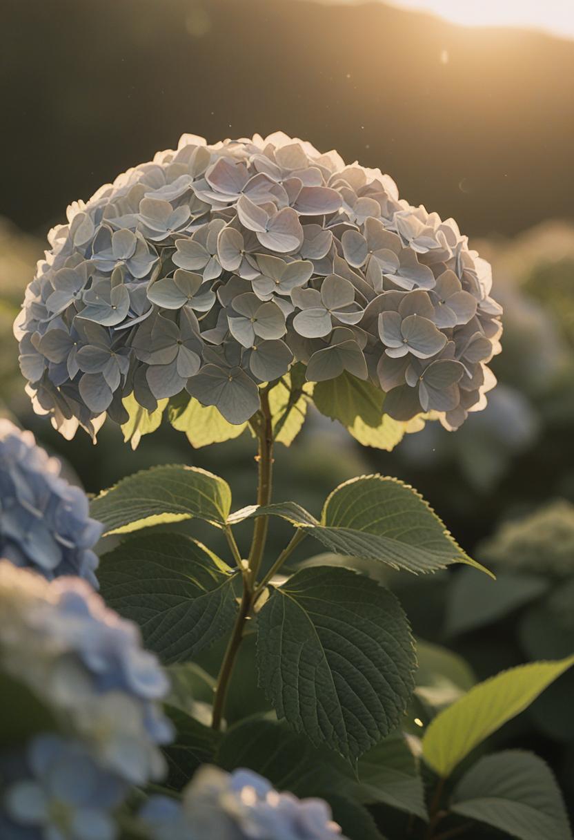 52. A wide-angle shot of a hydrangea in golden hour light, capturing its ethereal beauty with soft shadows and warm tones.