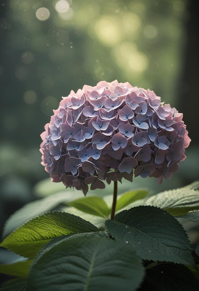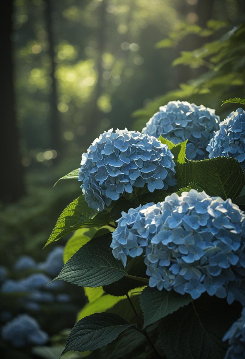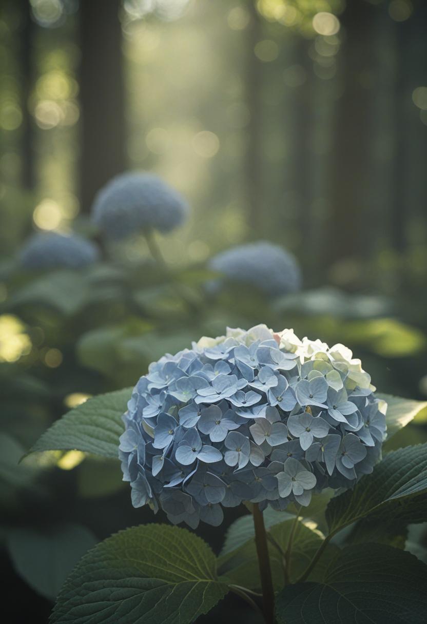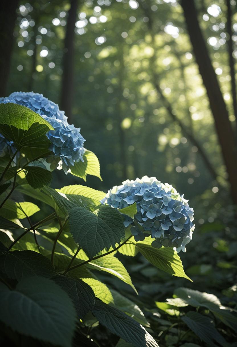 3. A hydrangea blooms softly under dappled forest light in an enchanted studio shot, blending nature's magic with artistic elegance.