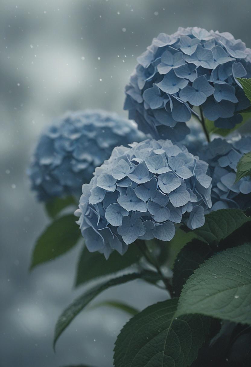 2. A dramatic hydrangea bathed in soft backlighting, captured in a calm wide-angle shot, exuding a serene and elegant hydrangea aesthetic.