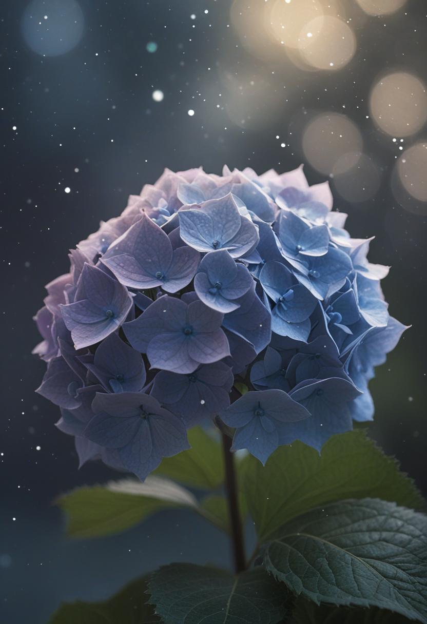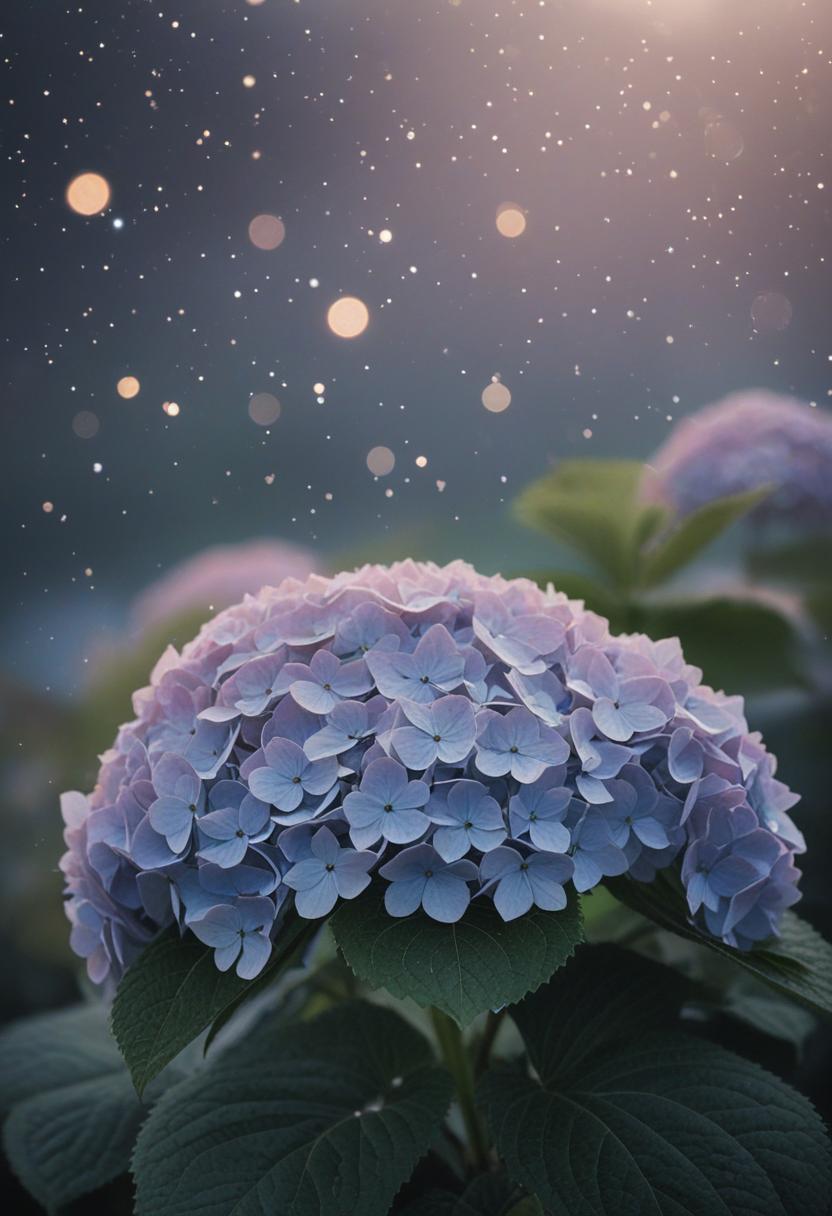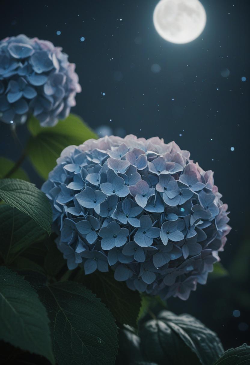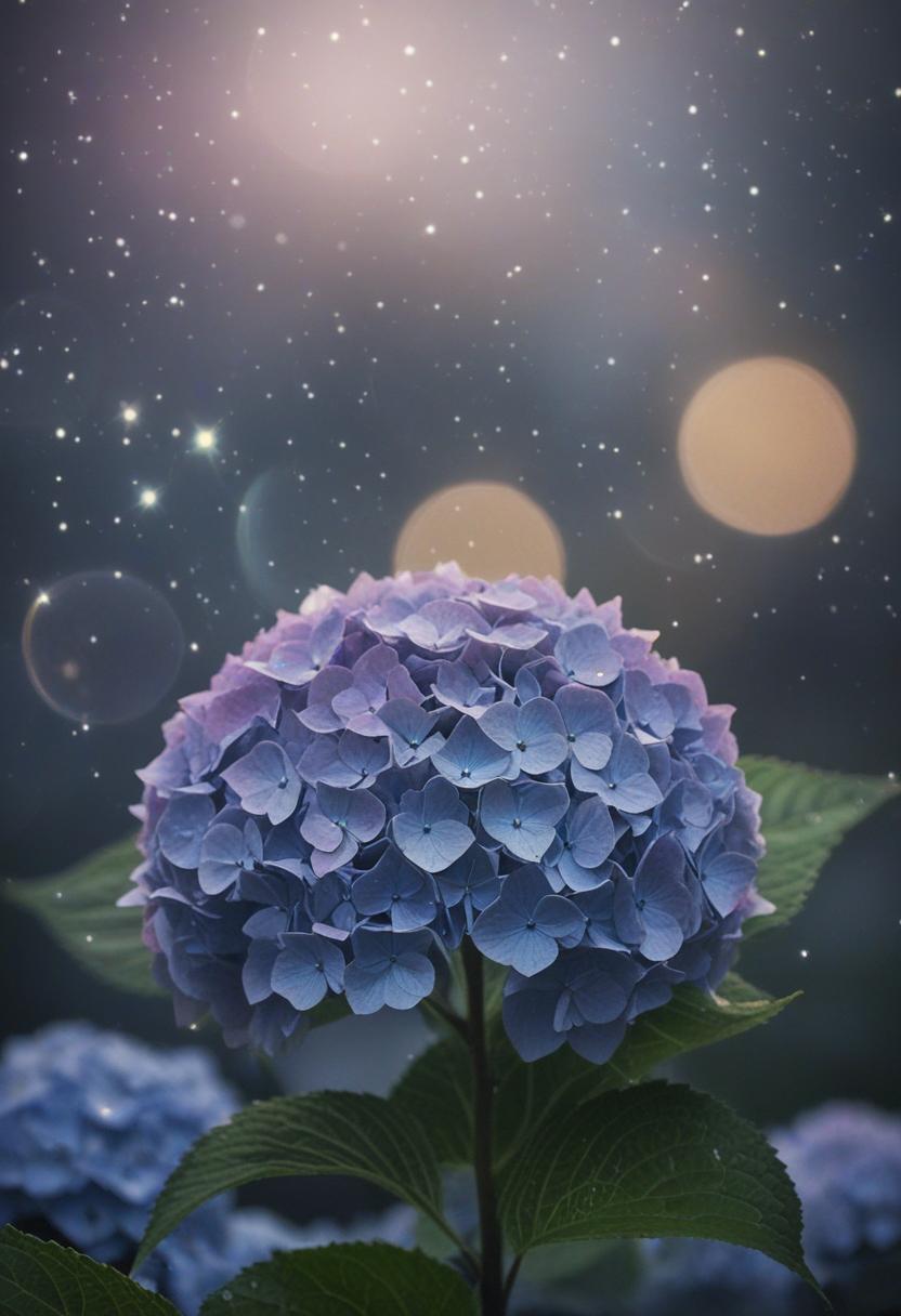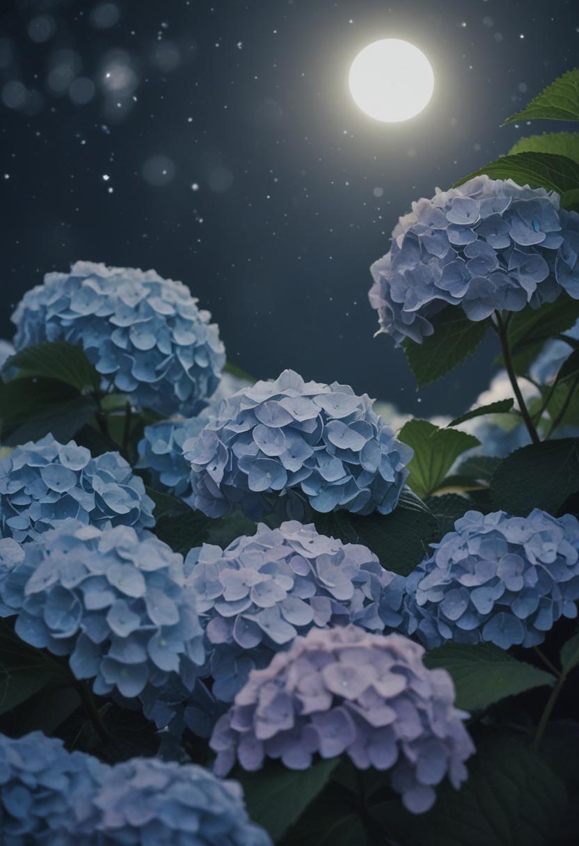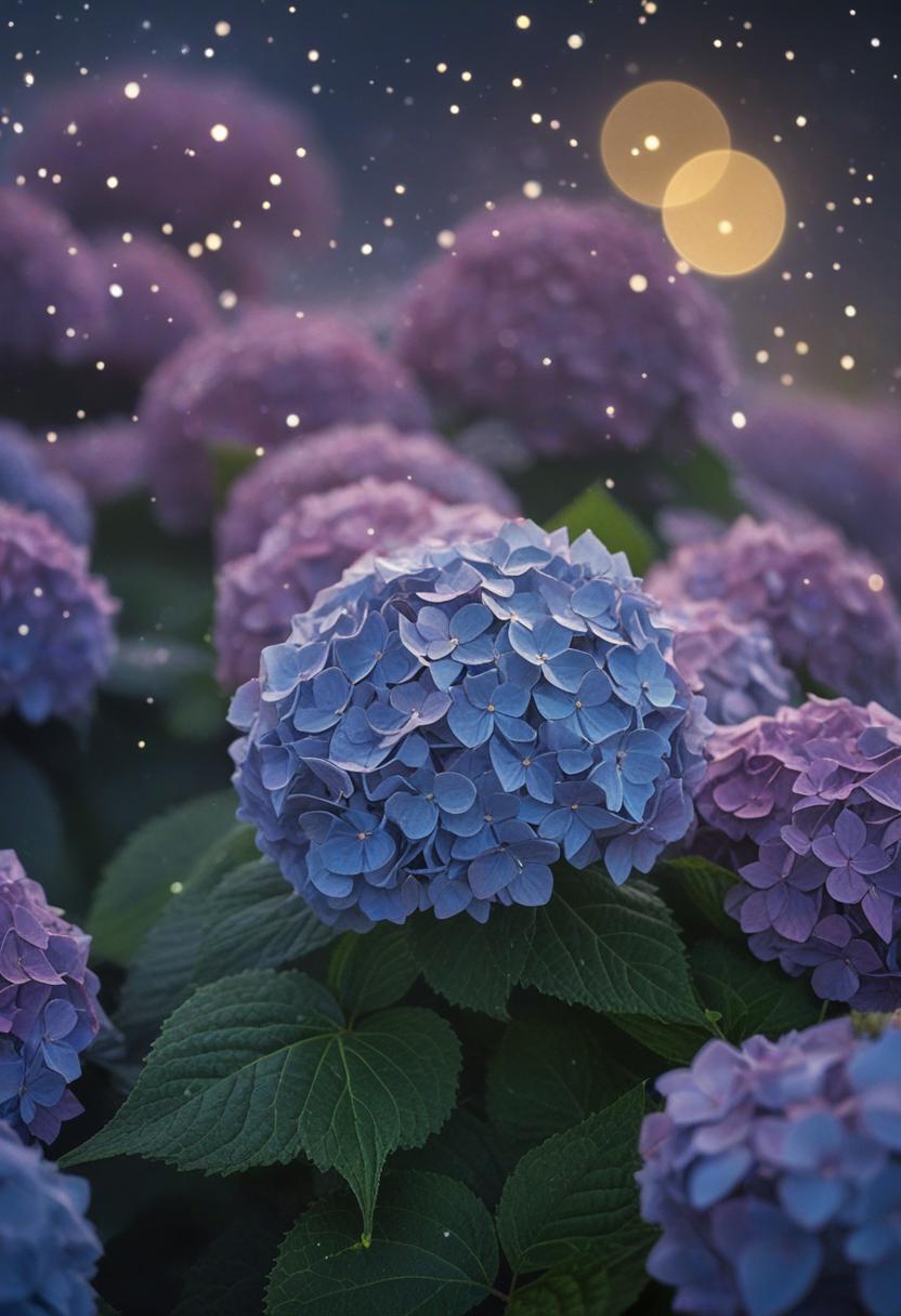 29. A vibrant hydrangea blooms under starlight, creating a magical, scenic view with a soft, dreamy aesthetic.