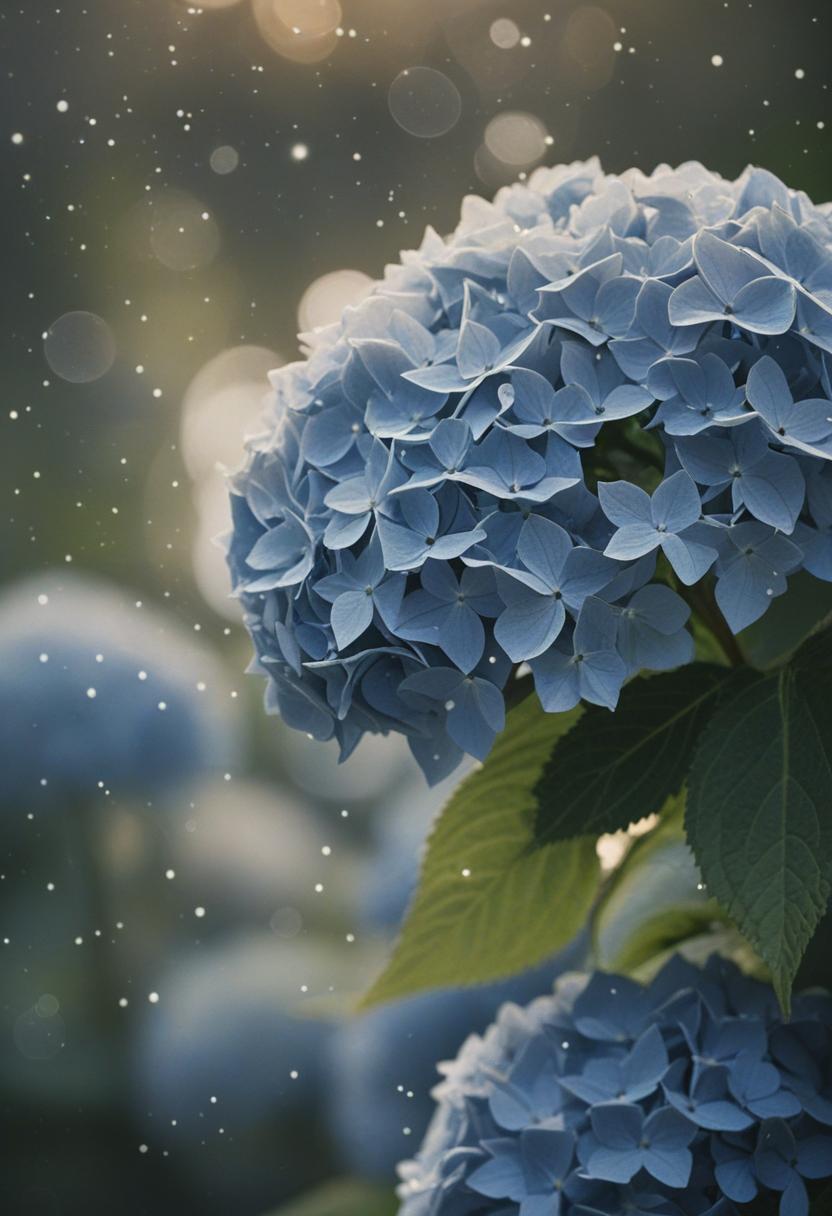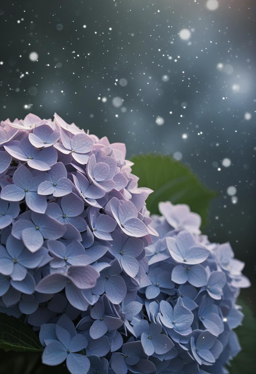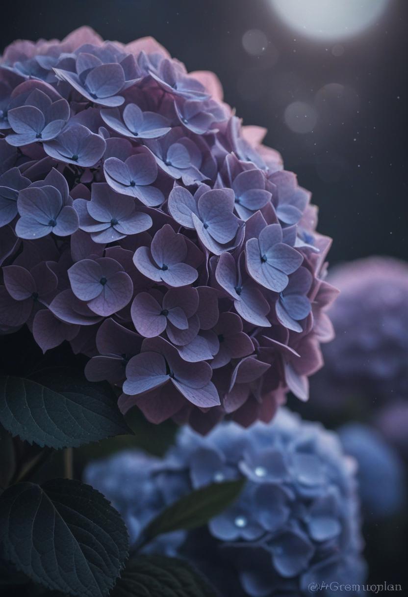 23. A surreal midshot of a hydrangea under starlight, blending dreamy aesthetics with soft, glowing light, creating a magical, otherworldly atmosphere.