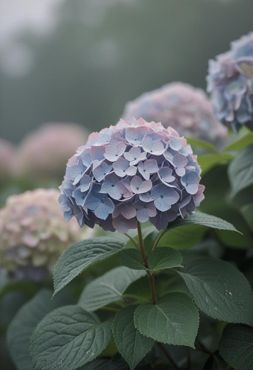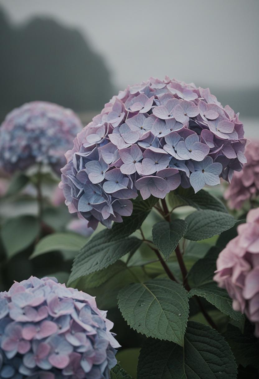 51. A serene midshot of a hydrangea under cloudy skies, exuding a calm, zen vibe with a soft, ethereal aesthetic.