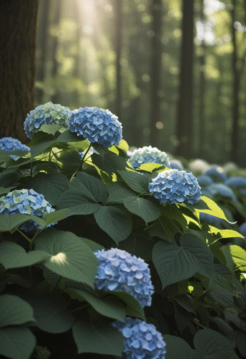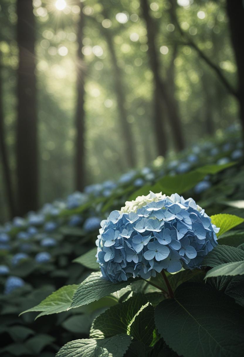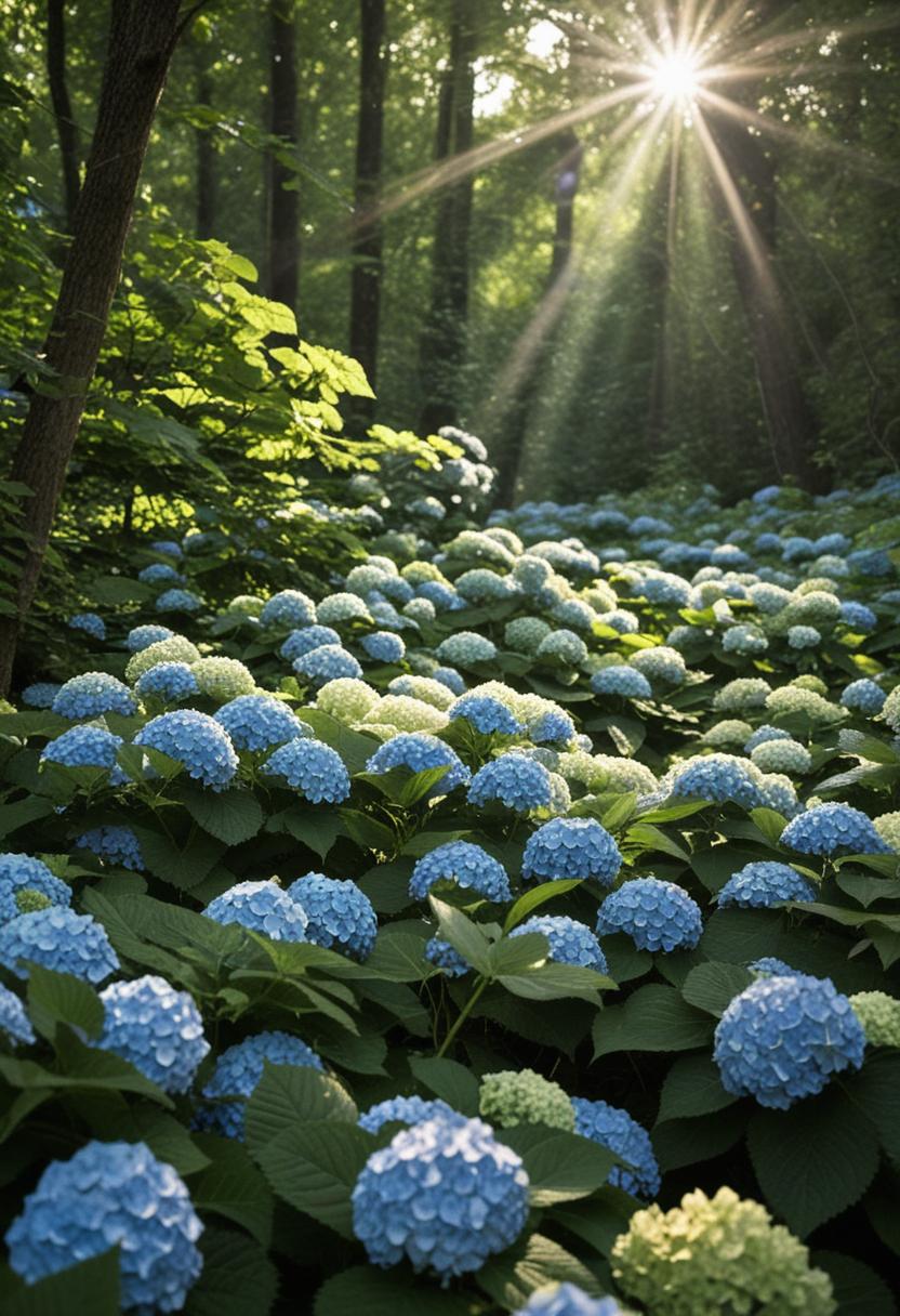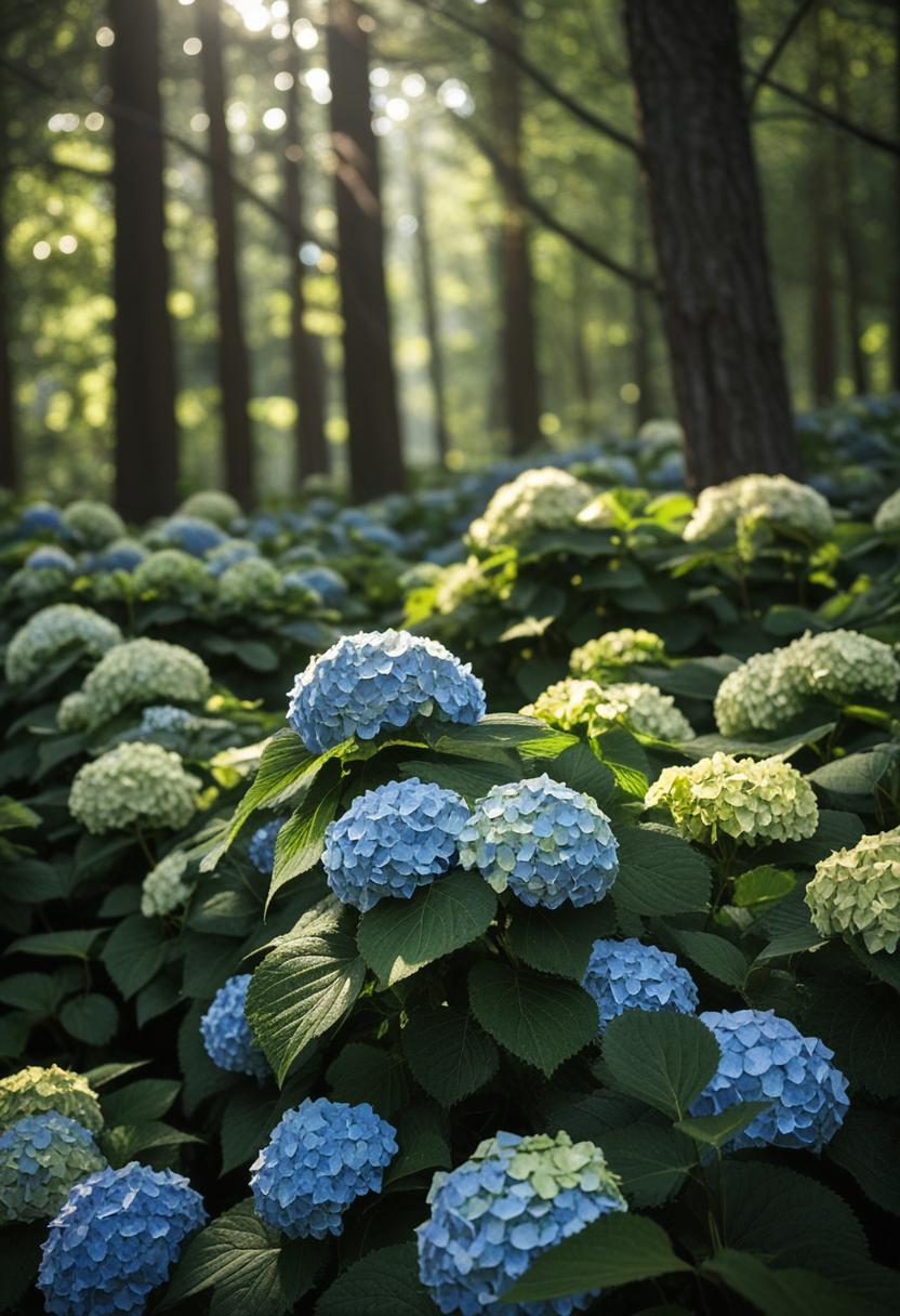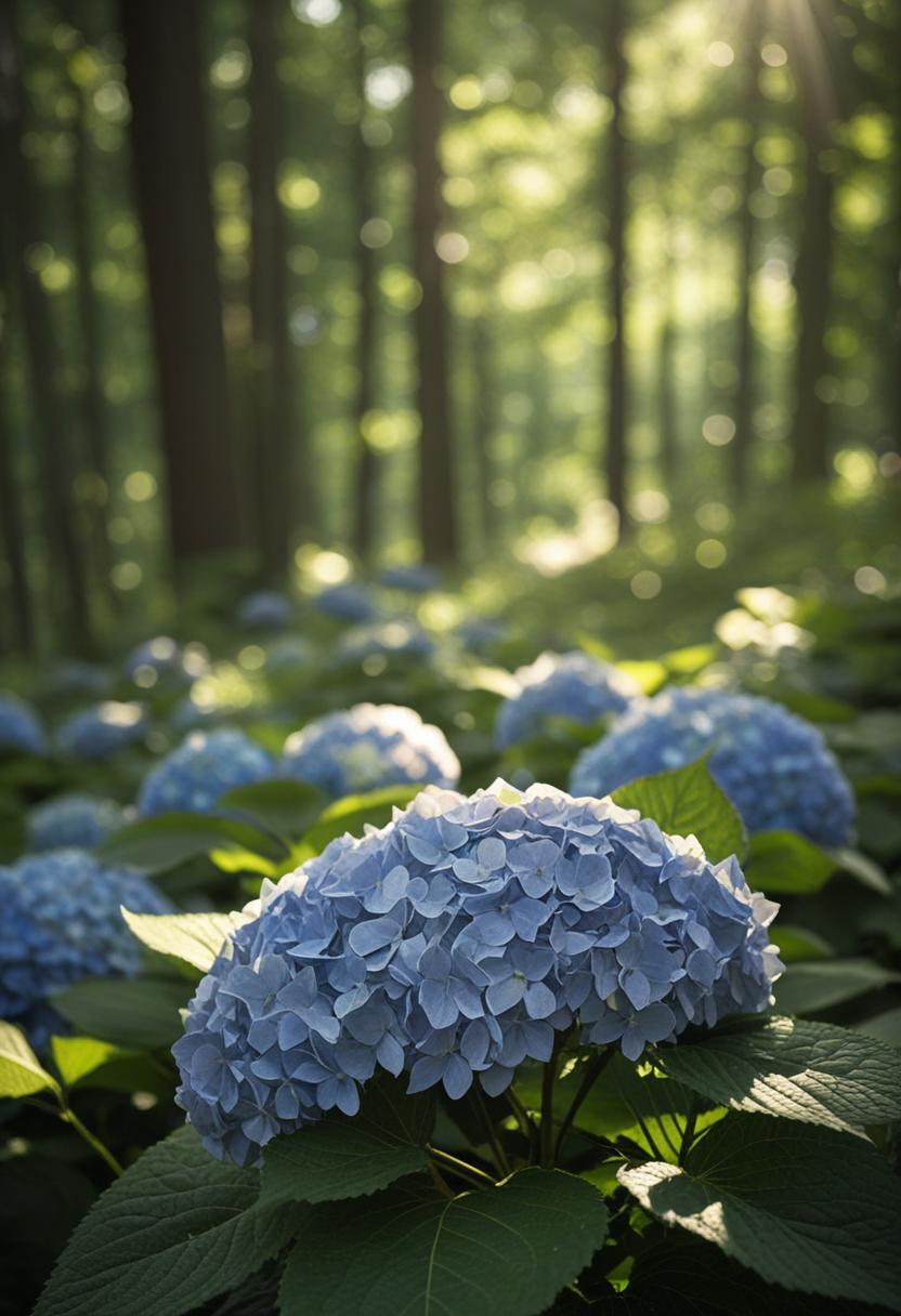75. A side view of an epic hydrangea scene bathed in dappled forest light, creating a serene and enchanting hydrangea aesthetic.