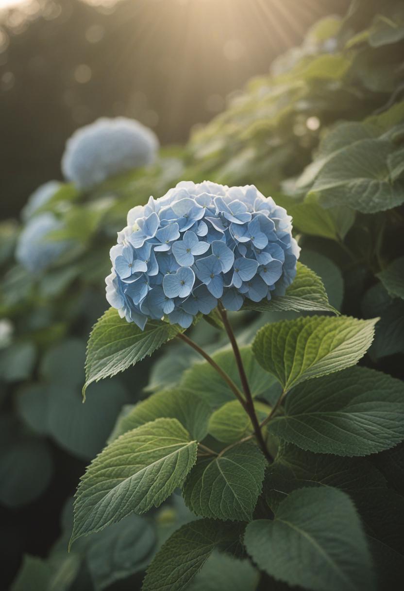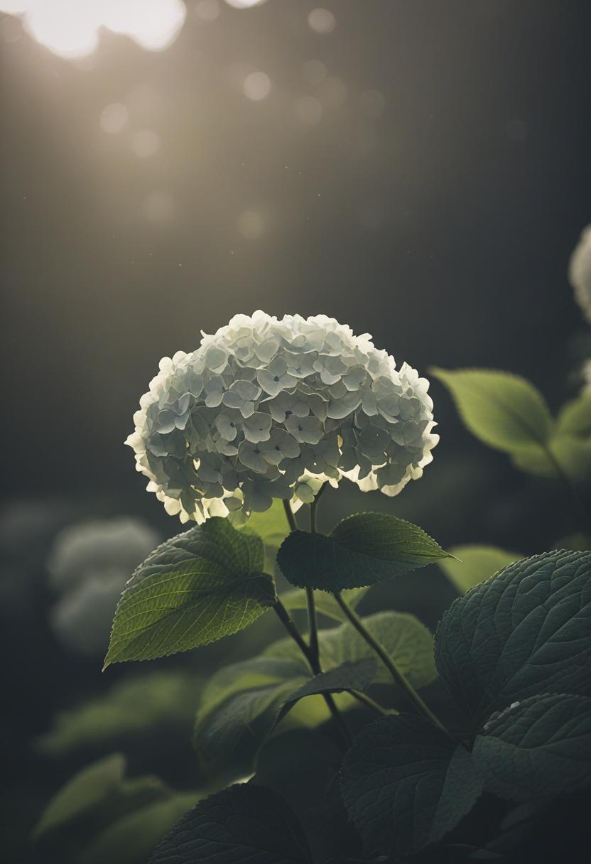 41. A striking midshot of a hydrangea silhouette bathed in soft, dramatic lighting, capturing the essence of the hydrangea aesthetic with an epic, atmospheric feel.