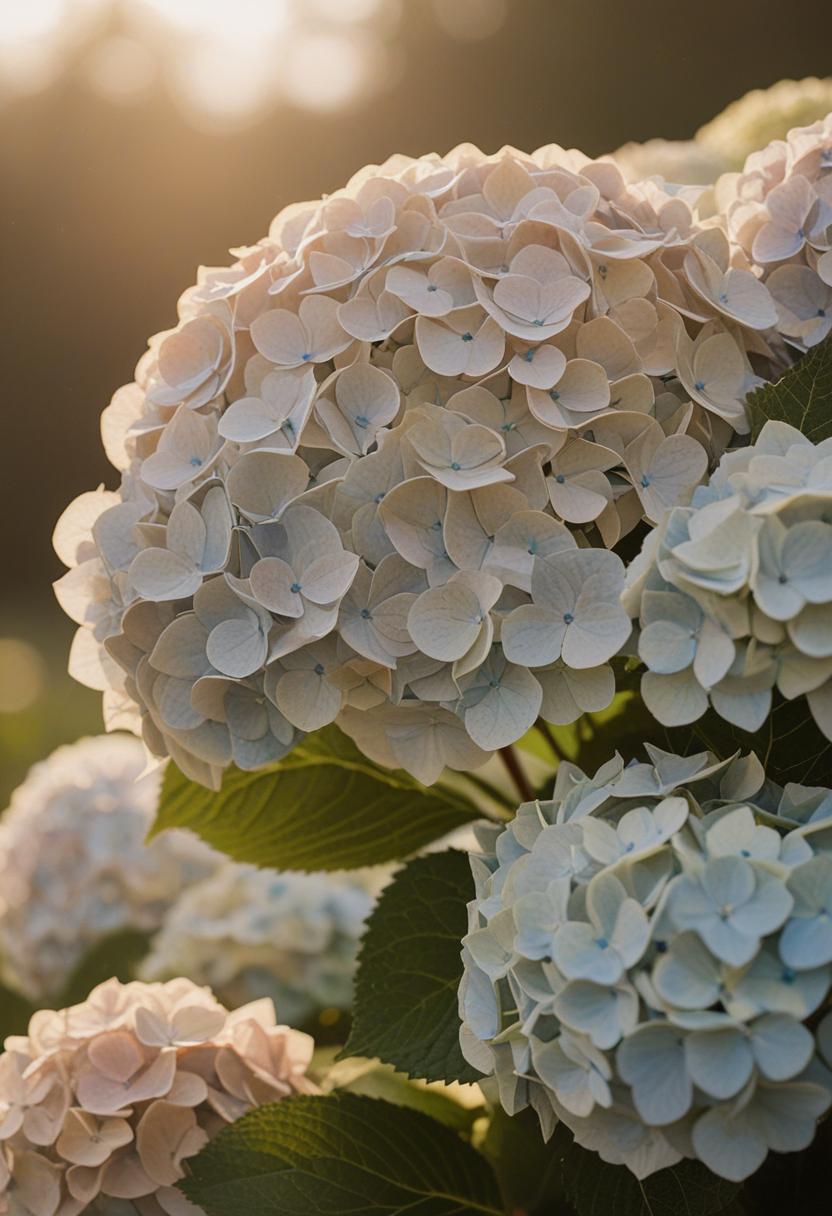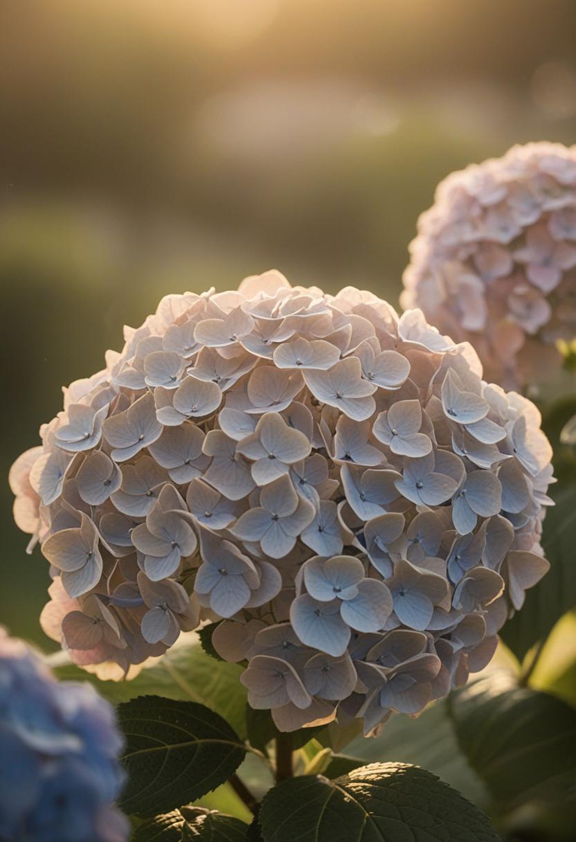 45. A golden hour midshot of a hydrangea, soft light casting dreamy shadows, evoking a serene, floral aesthetic with gentle warmth and ethereal beauty.