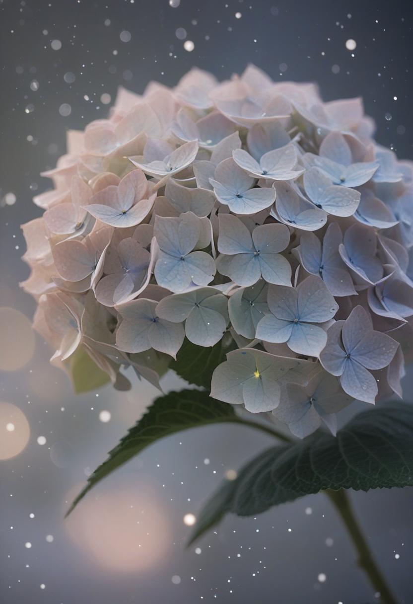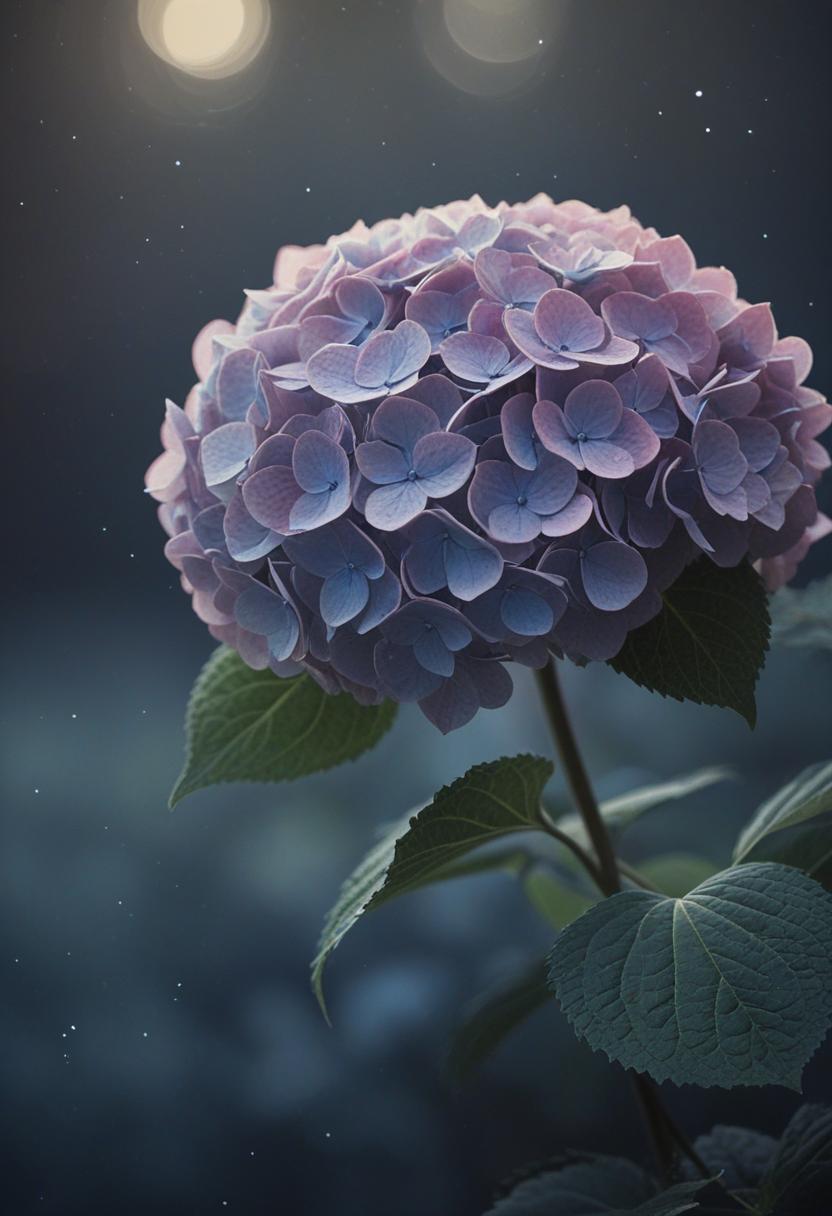26. A delicate hydrangea blooms under starlight, captured in an ethereal side view, exuding a soft, dreamy aesthetic.