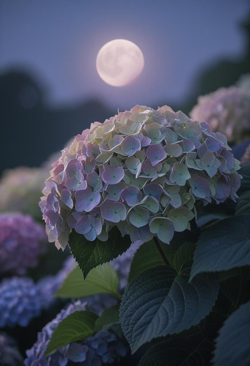 73. A vibrant hydrangea blooms under moonlight, creating a serene and magical scenic view with soft, ethereal lighting.