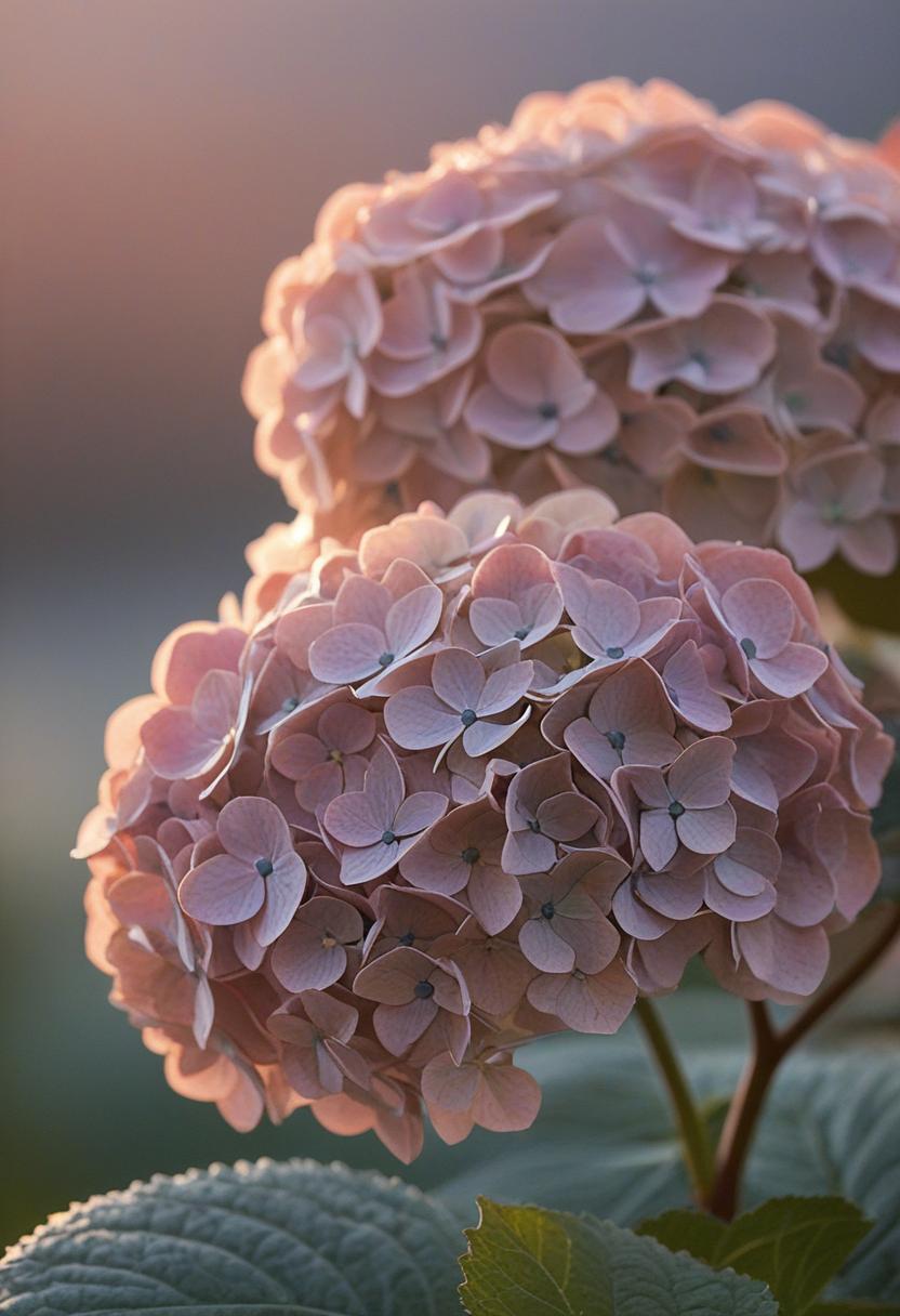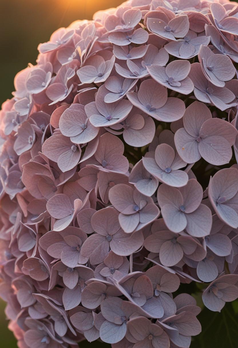 81. A close-up of a hydrangea bathed in soft sunset hues, exuding calm and serenity with a gentle, dreamy aesthetic.