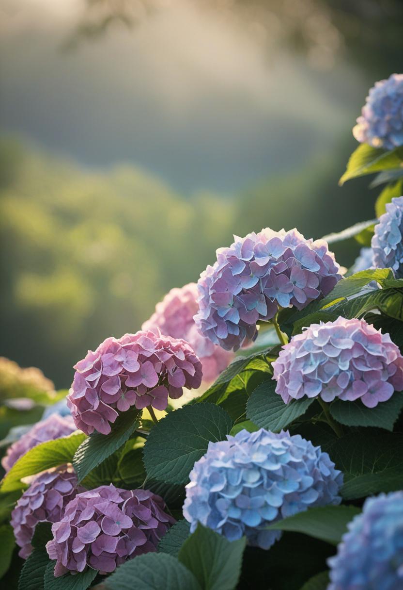 59. A soft morning light bathes a vibrant hydrangea garden in a serene, scenic view, capturing the hydrangea aesthetic with gentle hues and peaceful atmosphere.