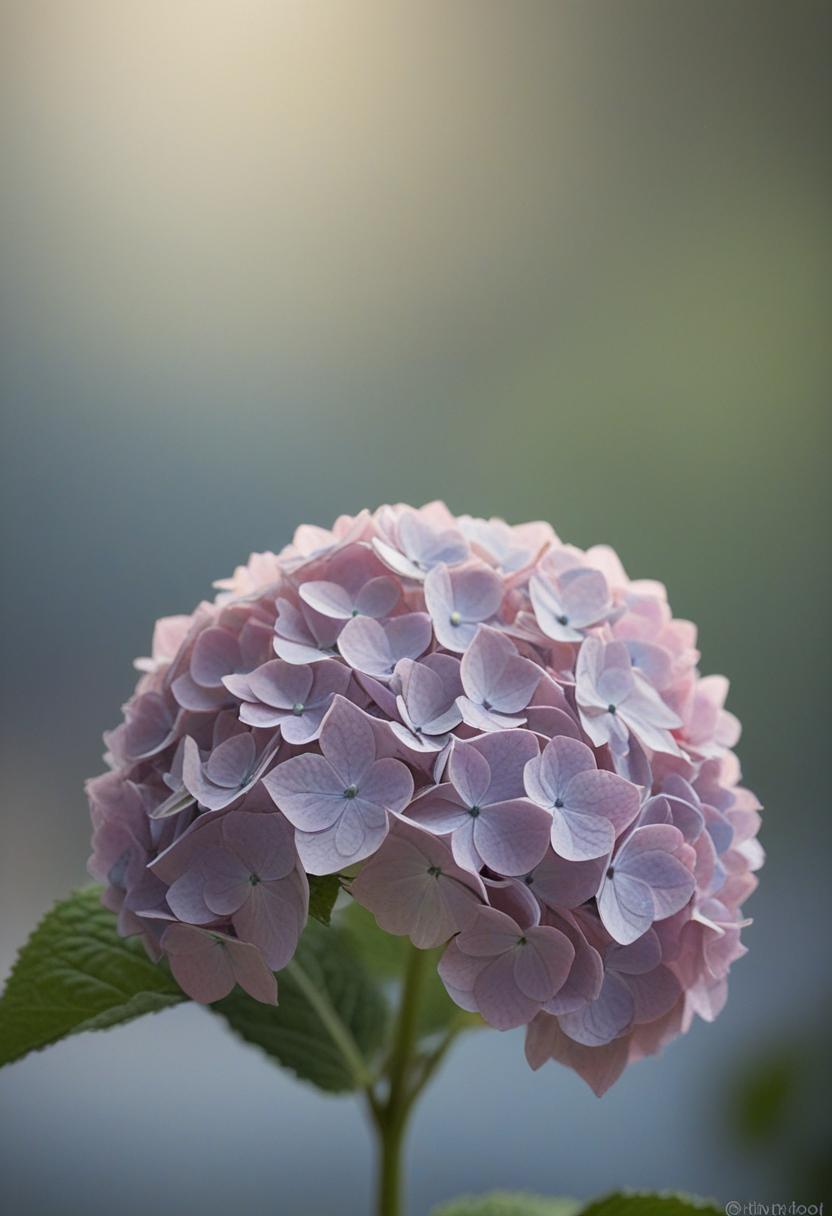 61. A serene close-up of a hydrangea under a soft, cloudy sky, exuding a calm, zen atmosphere with a gentle, aesthetic glow.