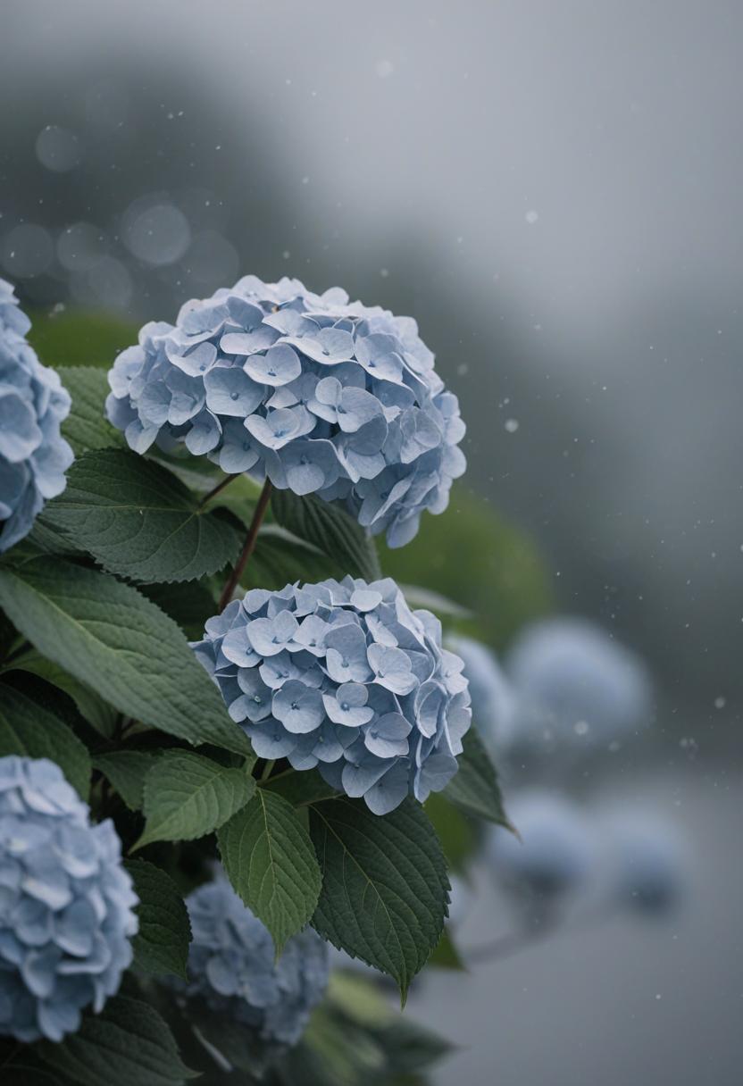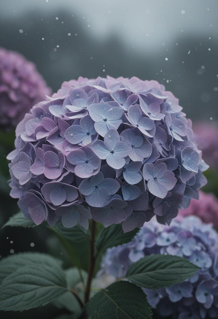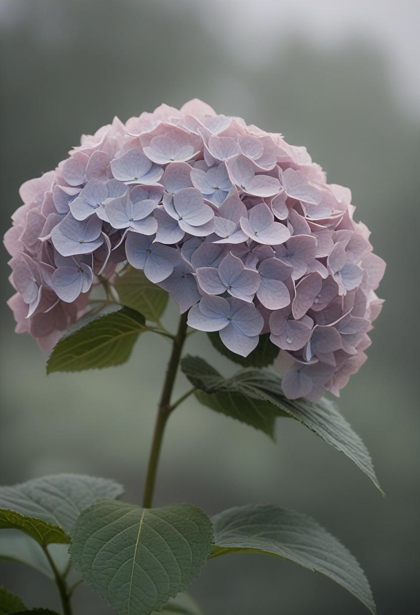 33. A midshot of a hydrangea under a dreamy, overcast sky, blending nature and fantasy with soft light and ethereal atmosphere.