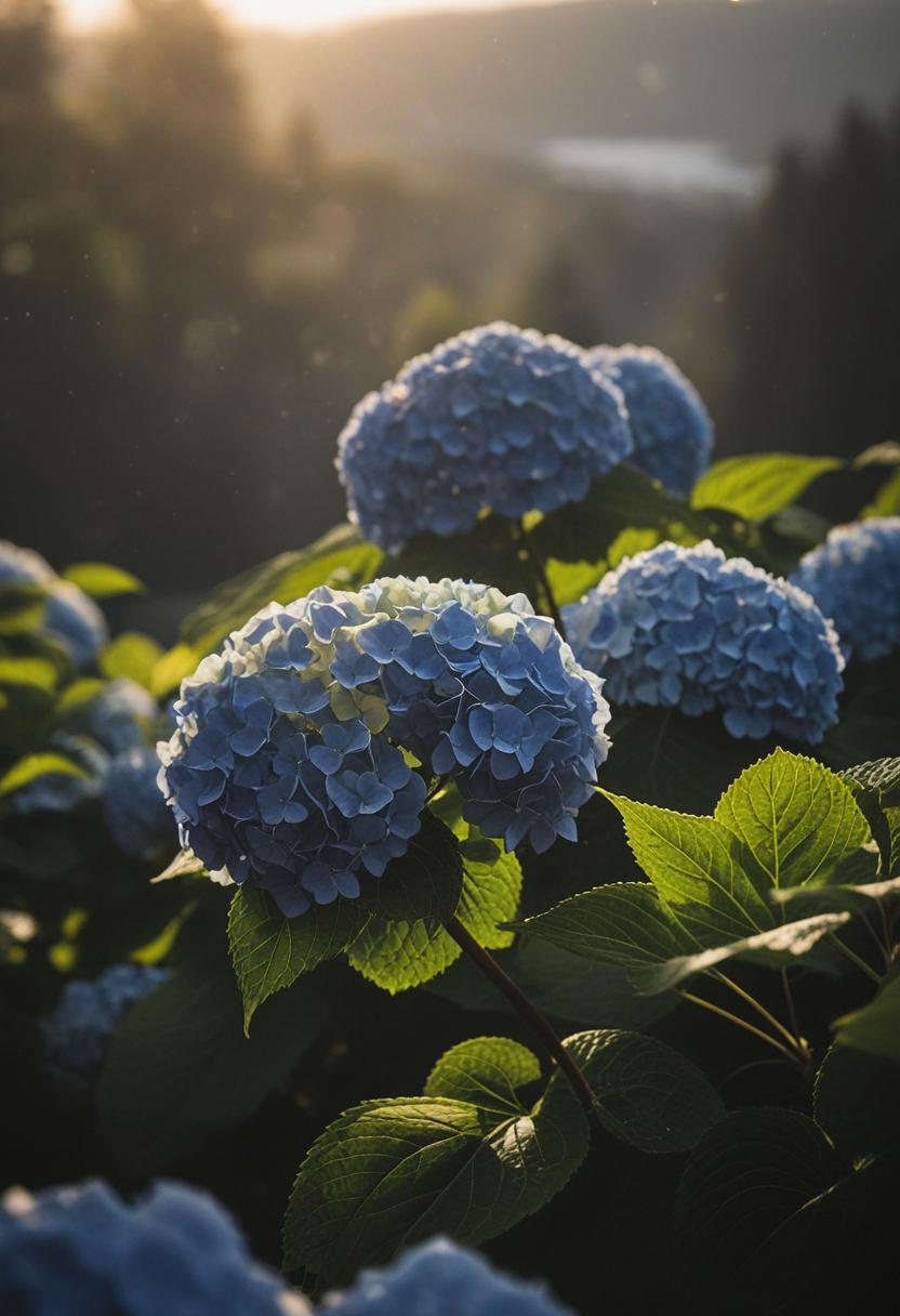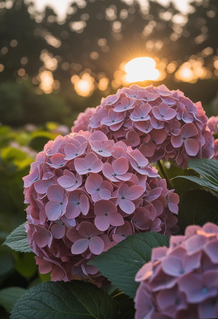 34. A serene hydrangea garden bathed in a magical sunset glow, creating an enchanted, scenic view of nature’s beauty.