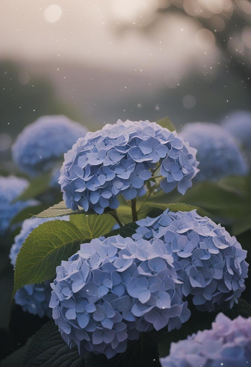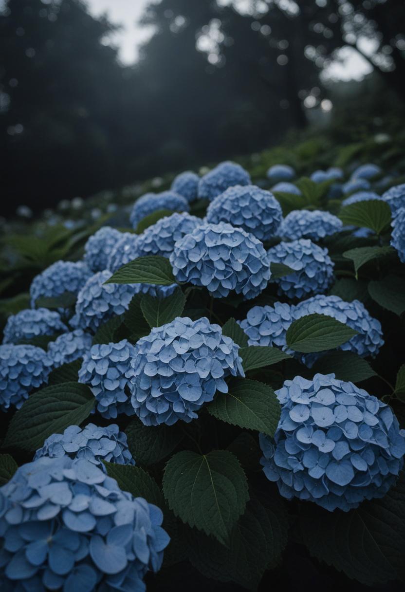 95. A moody wide-angle shot of a hydrangea under starlight, capturing a dreamy, ethereal hydrangea aesthetic with soft lighting and atmospheric depth.