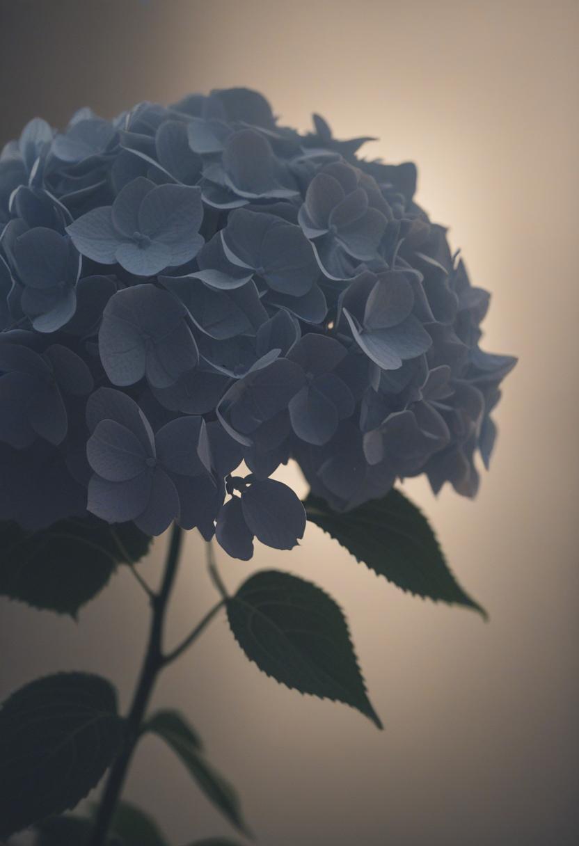 100. A minimalist midshot of a hydrangea silhouette illuminated by soft lighting, capturing the serene beauty of the flower in a clean, artistic composition.