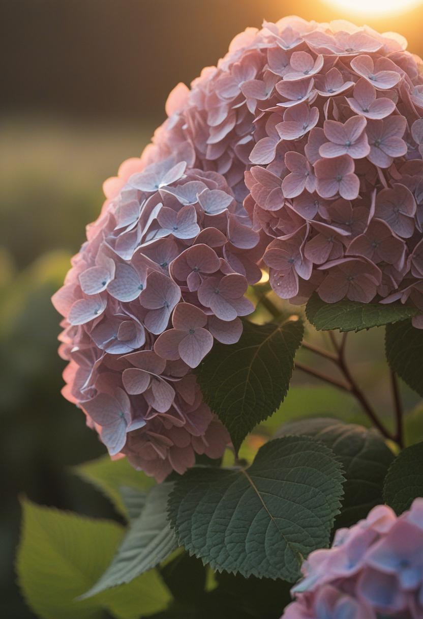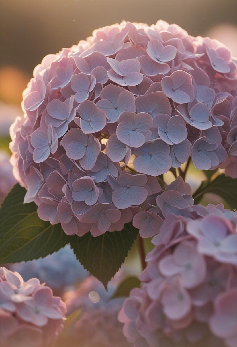 42. A cozy midshot of a hydrangea bathed in a soft sunset glow, capturing a serene, dreamy hydrangea aesthetic with warm hues and gentle lighting.