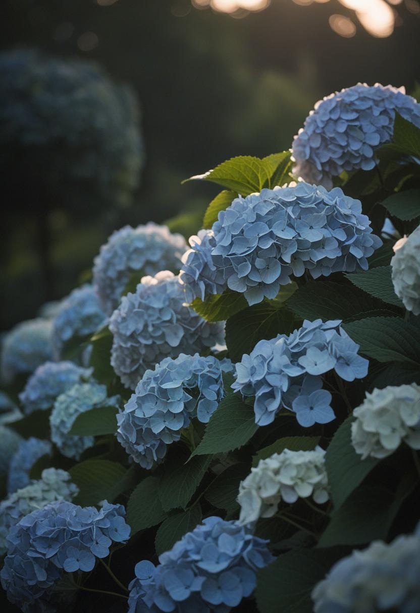 98. A serene hydrangea garden bathed in golden hour light, exuding calm and beauty.