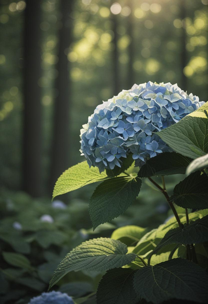15. A wide-angle shot captures an ethereal hydrangea in dappled forest light, creating a serene, dreamy hydrangea aesthetic.