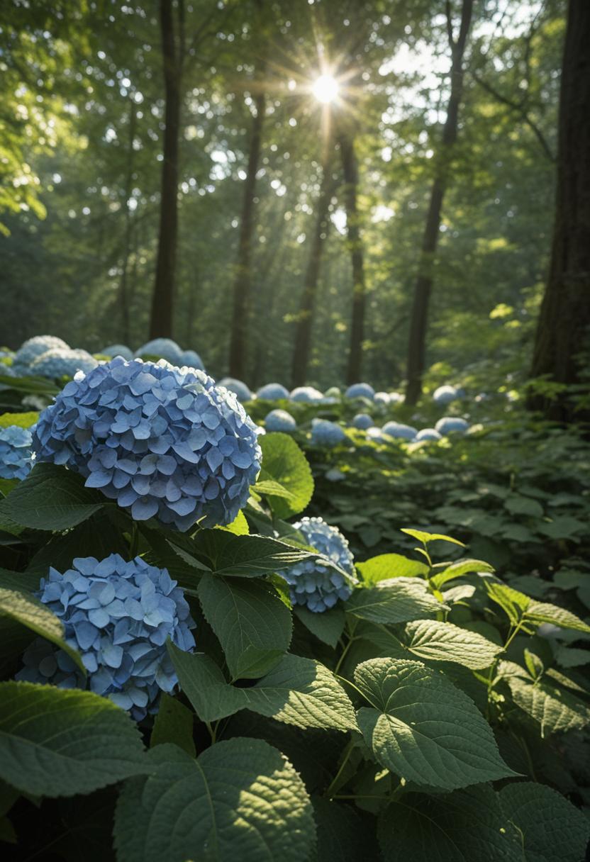 76. A serene hydrangea aesthetic scene under dappled forest light, bathed in a soft, golden glow, creating a peaceful and scenic natural view.