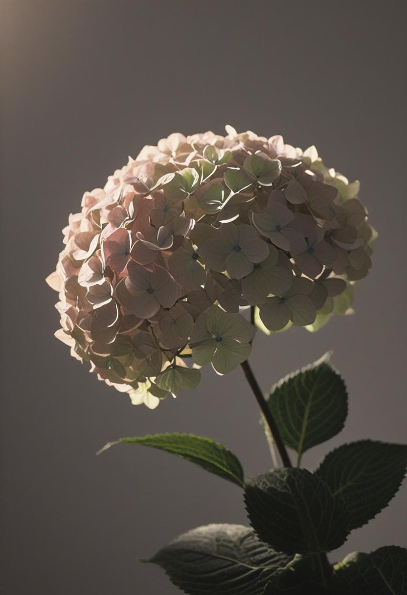 20. A soft hydrangea silhouette bathes in warm lighting, captured in a cozy studio setting.