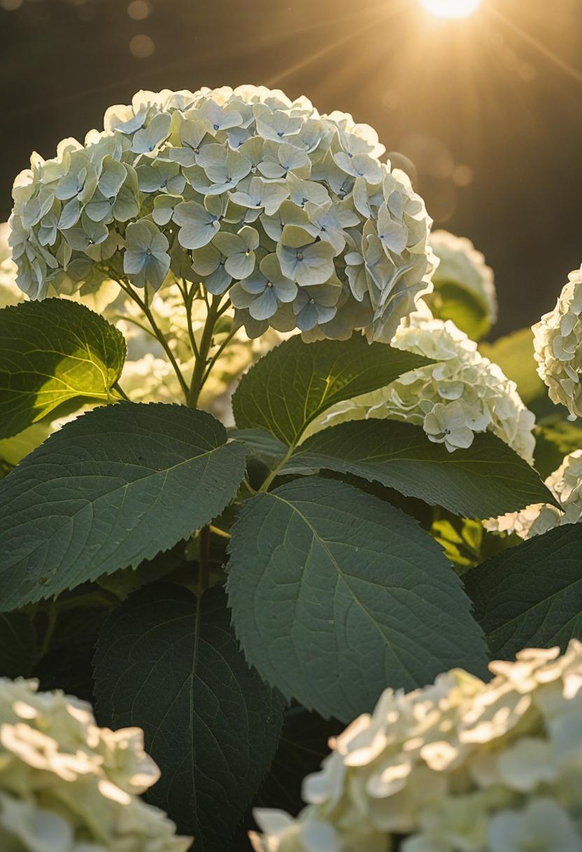 7. A hydrangea blooms under dramatic backlighting, casting soft shadows. Cozy and serene, the top-down view highlights its delicate petals and lush green leaves.