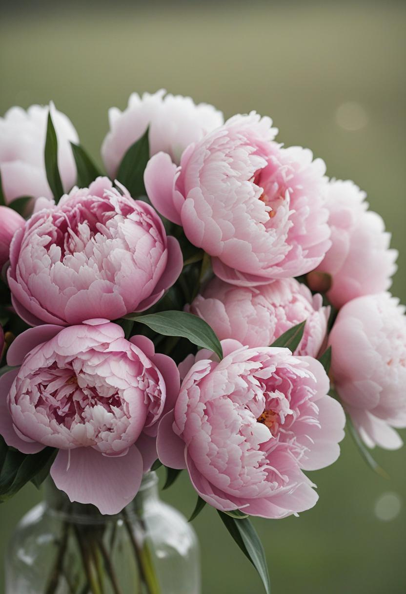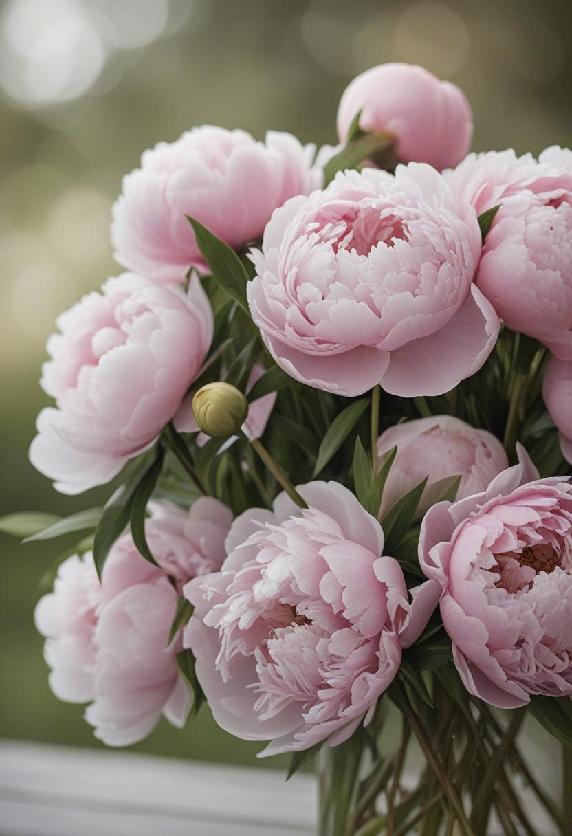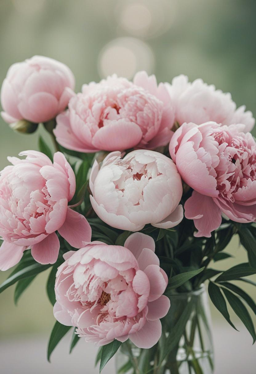 10. A vibrant bouquet of peonies in soft pastel hues, arranged in a graceful, flowing style. The soft petals and lush greenery create a romantic, elegant floral display.