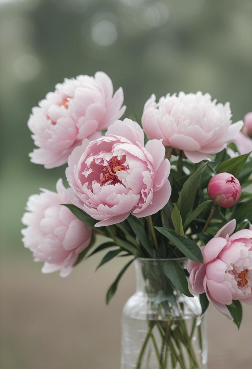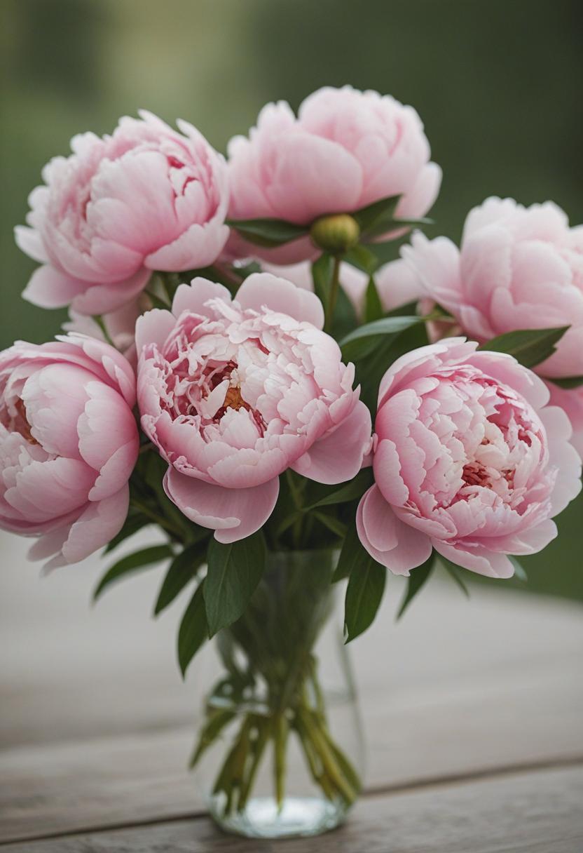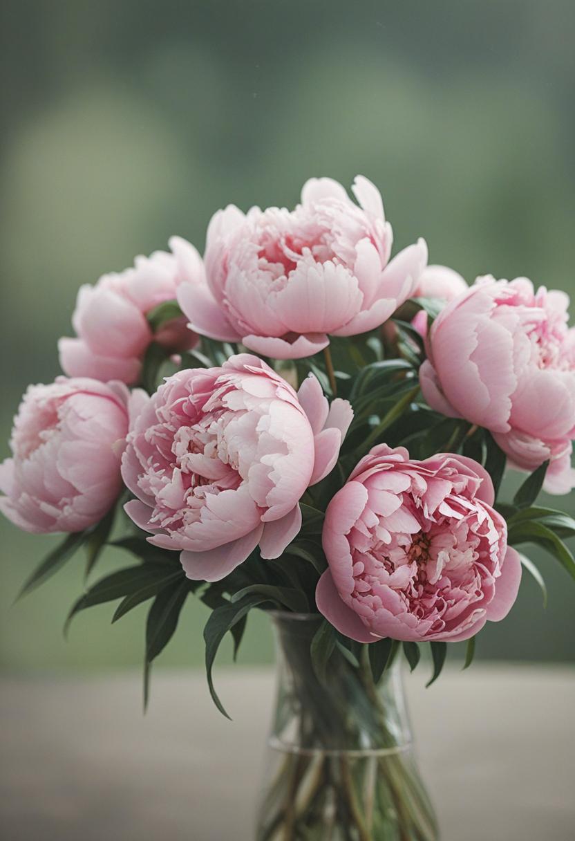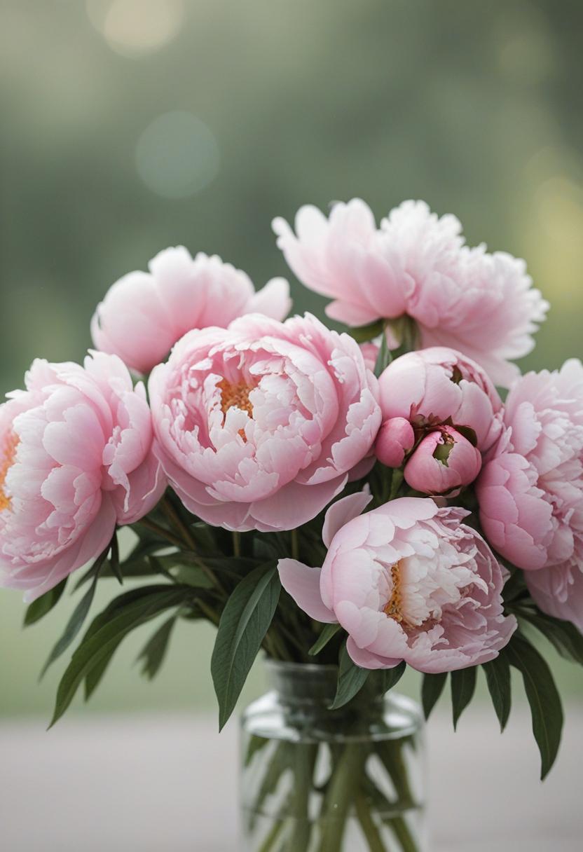 4. A lush bouquet of peonies arranged in a soft pastel vase, showcasing vibrant blooms in shades of pink and white. The arrangement exudes elegance and springtime charm, with delicate foliage adding a natural touch.