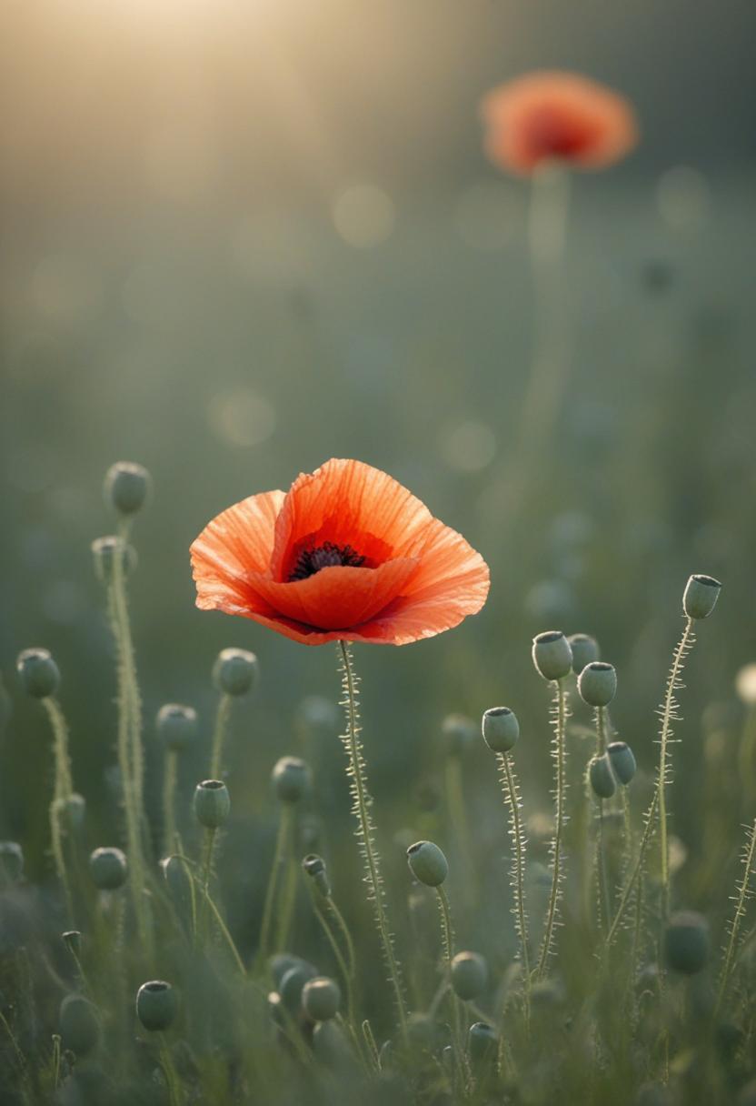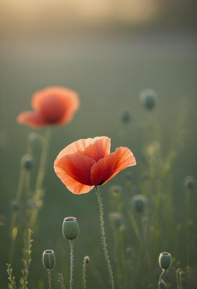 3. A soft, dreamy studio shot of a poppy in morning light, evoking a gentle, serene mood with its delicate petals and warm glow.
