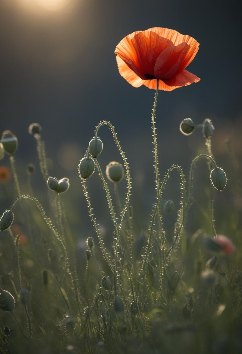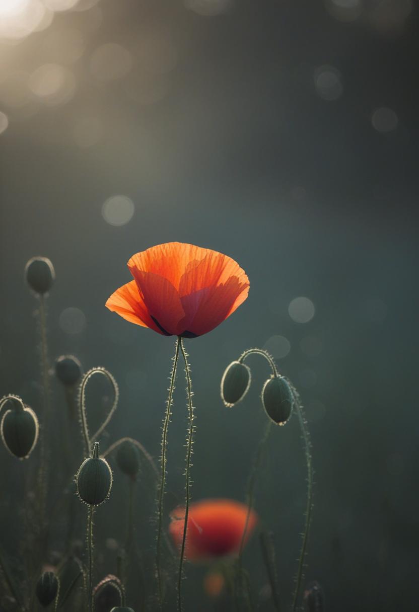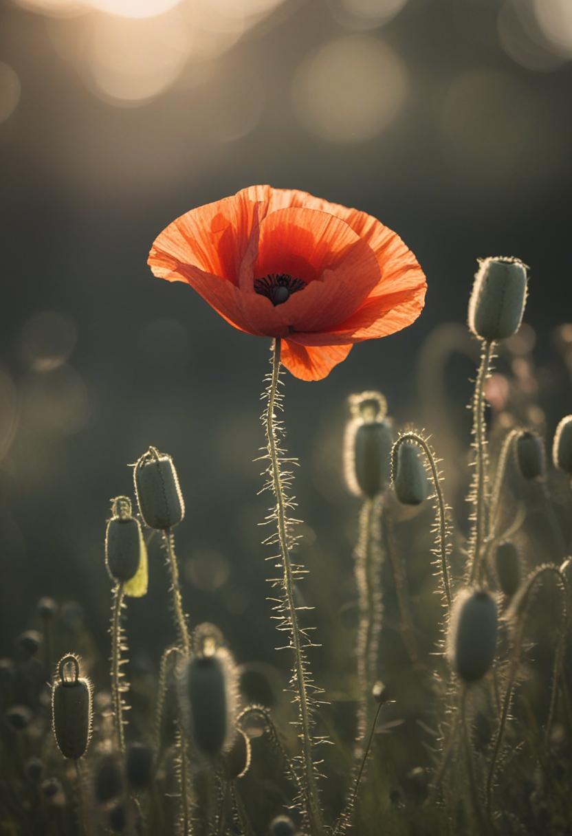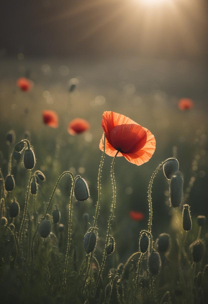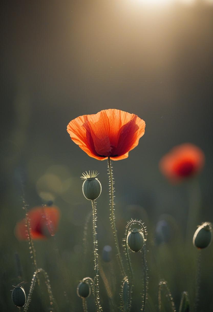 74. A dramatic midshot of a poppy under ethereal backlighting, exuding a dreamy, poetic vibe with soft shadows and a whimsical, artistic atmosphere.