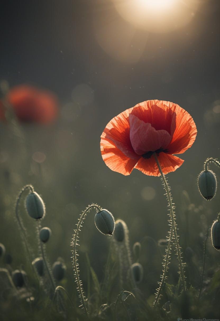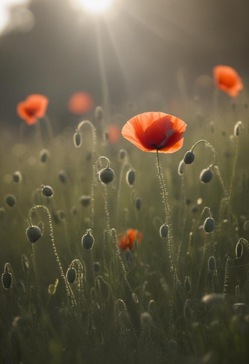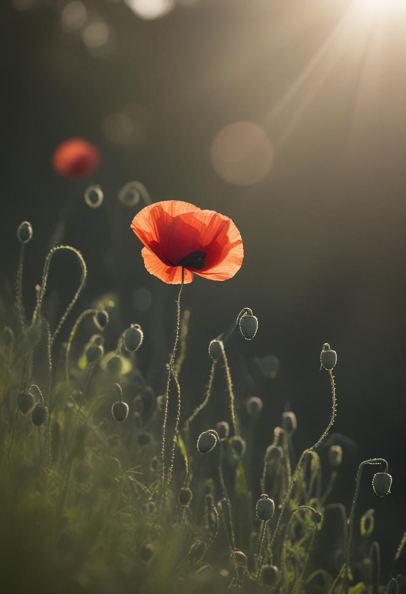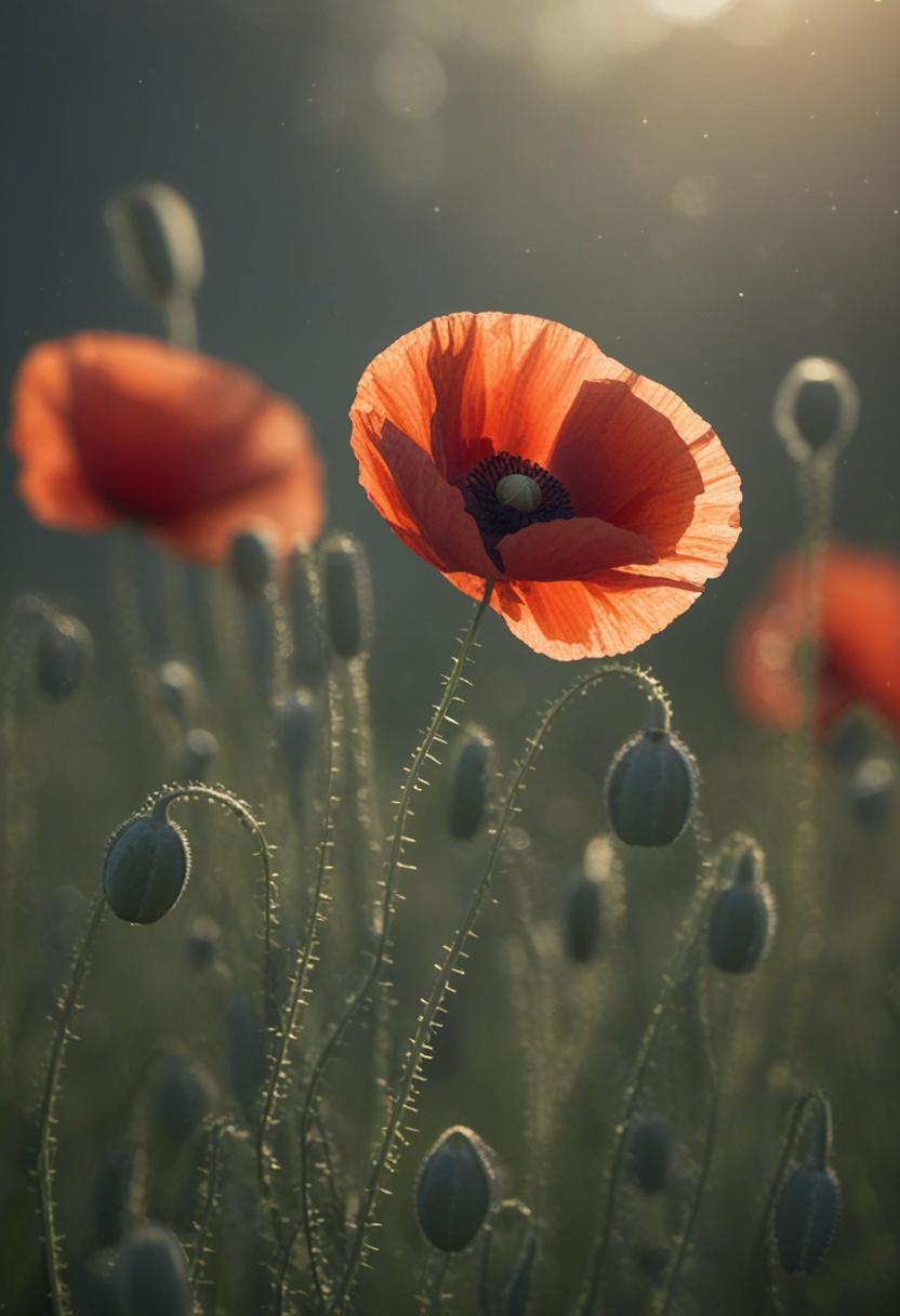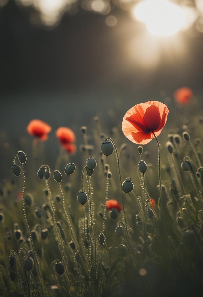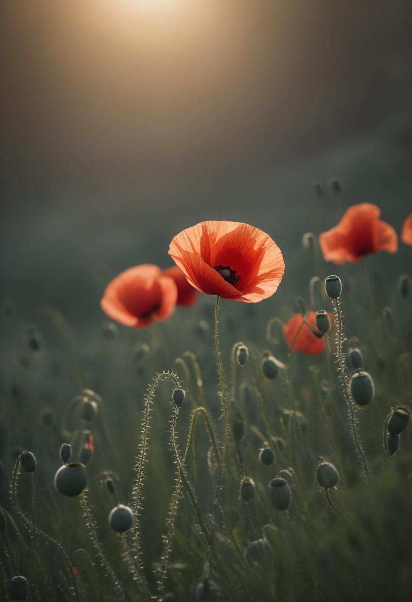 74. A dramatic midshot of a poppy under ethereal backlighting, exuding a dreamy, poetic vibe with soft shadows and a whimsical, artistic atmosphere.