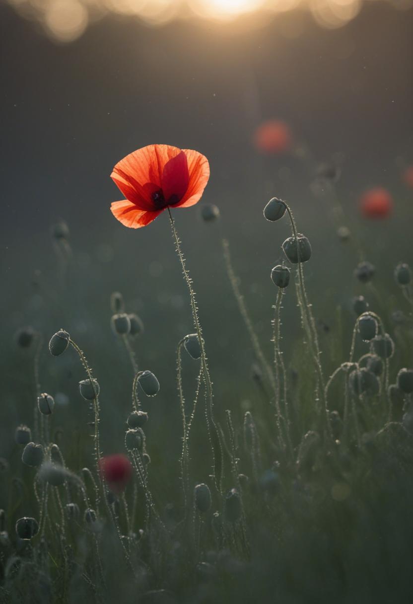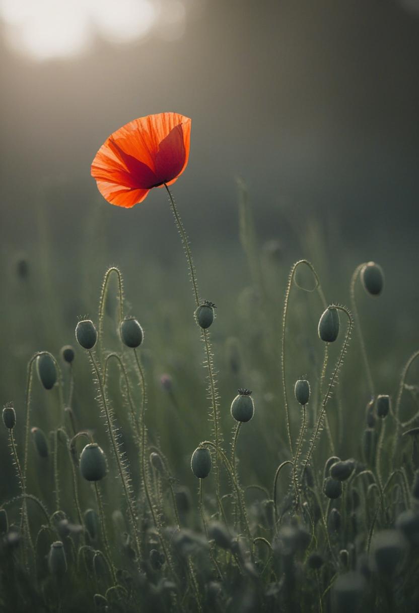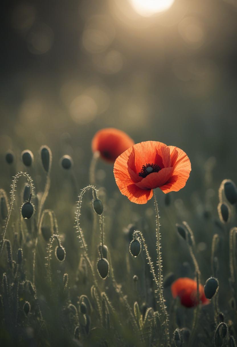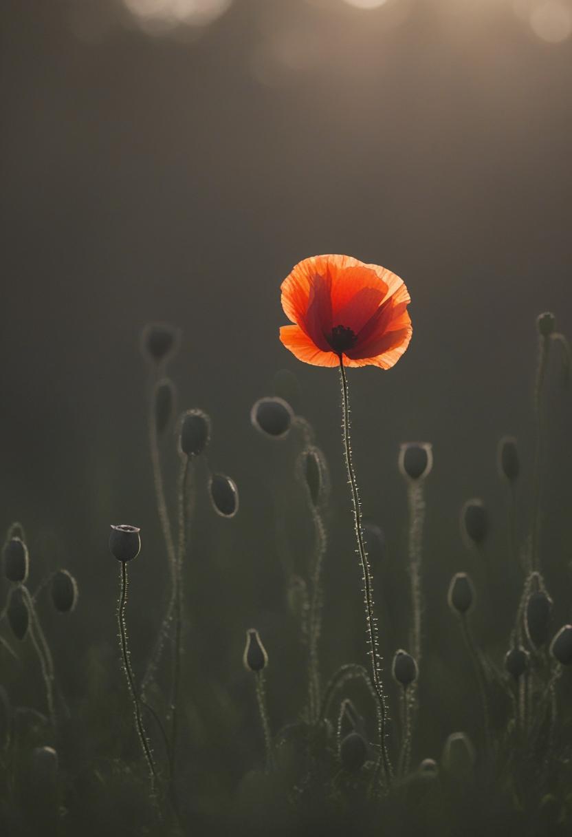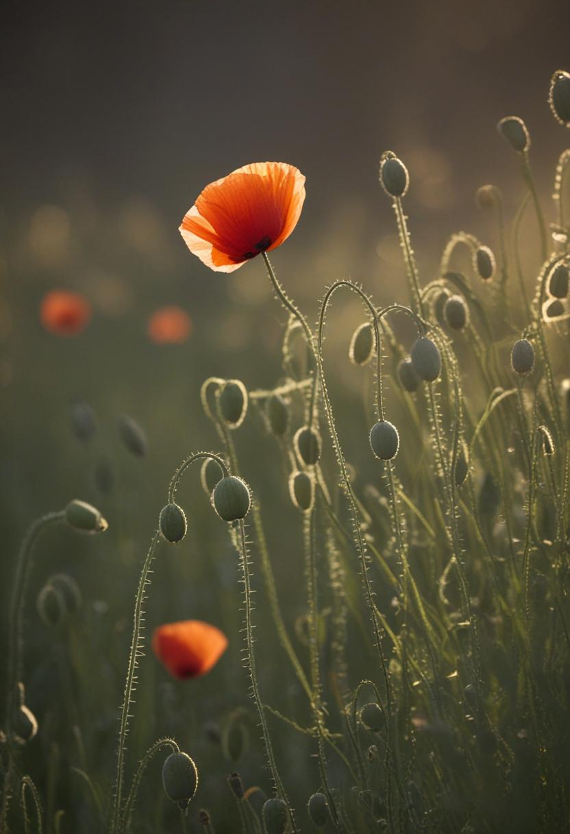 74. A dramatic midshot of a poppy under ethereal backlighting, exuding a dreamy, poetic vibe with soft shadows and a whimsical, artistic atmosphere.