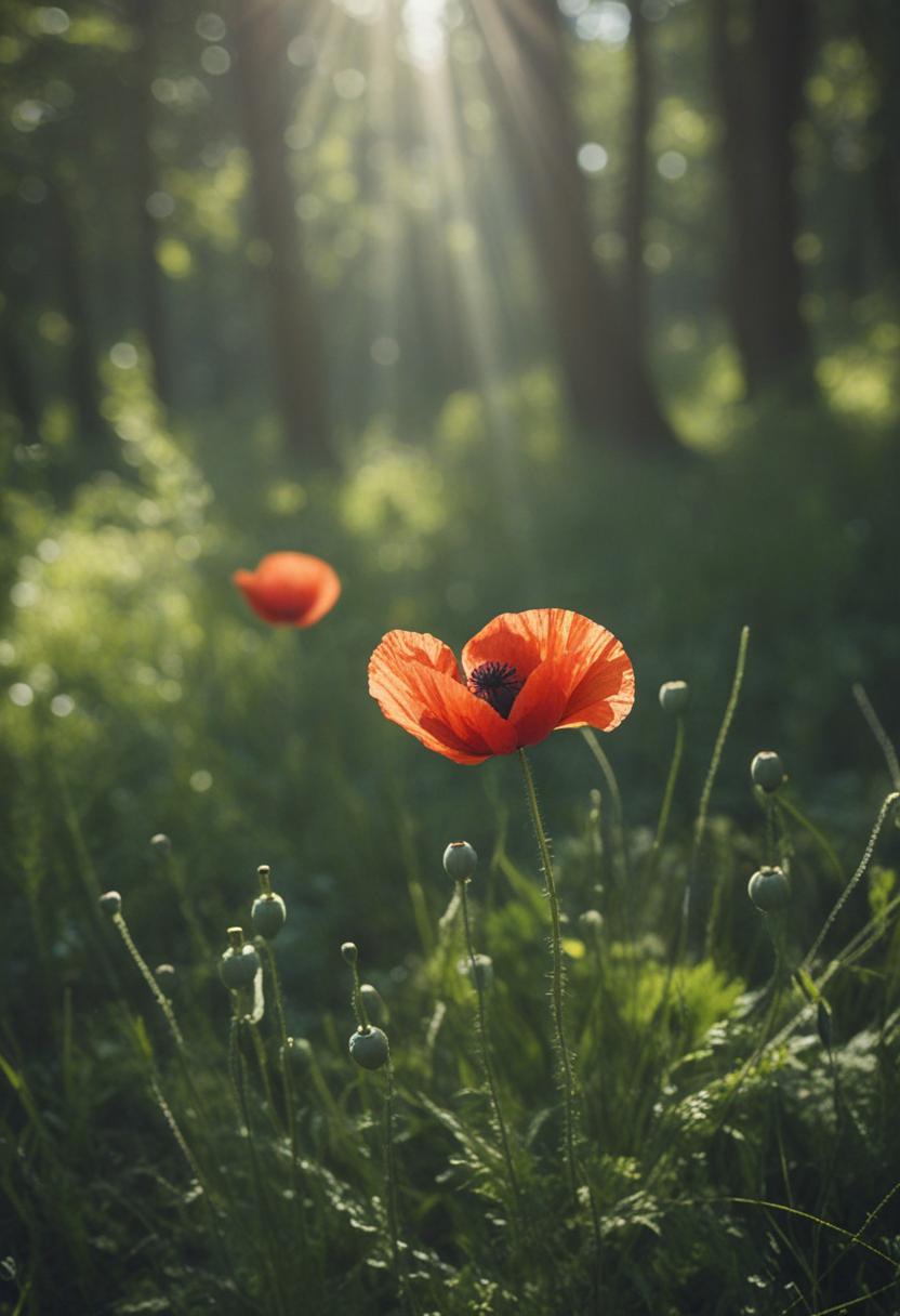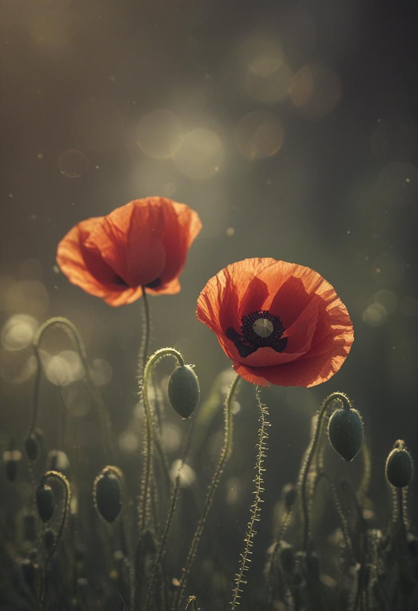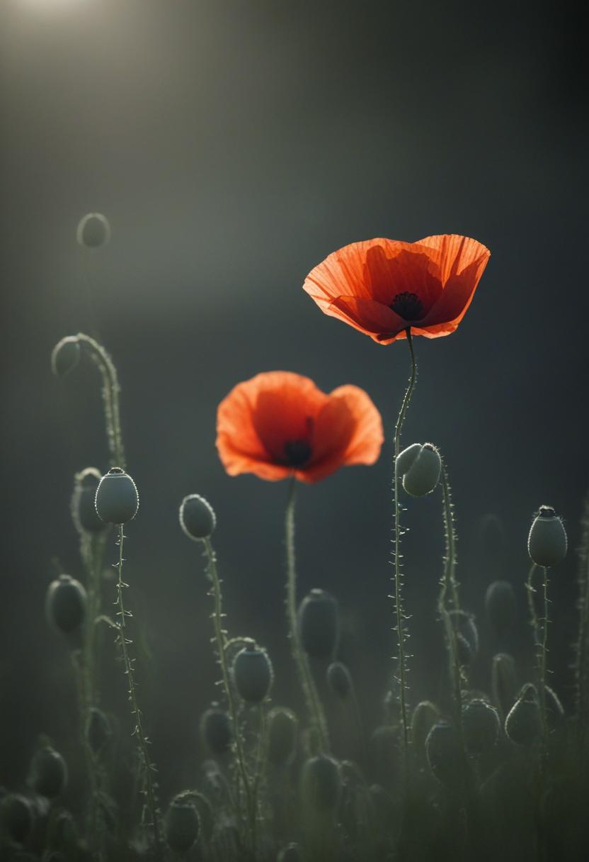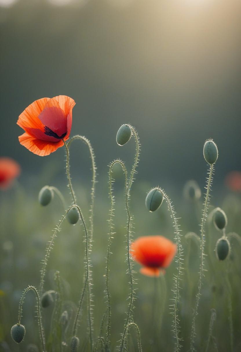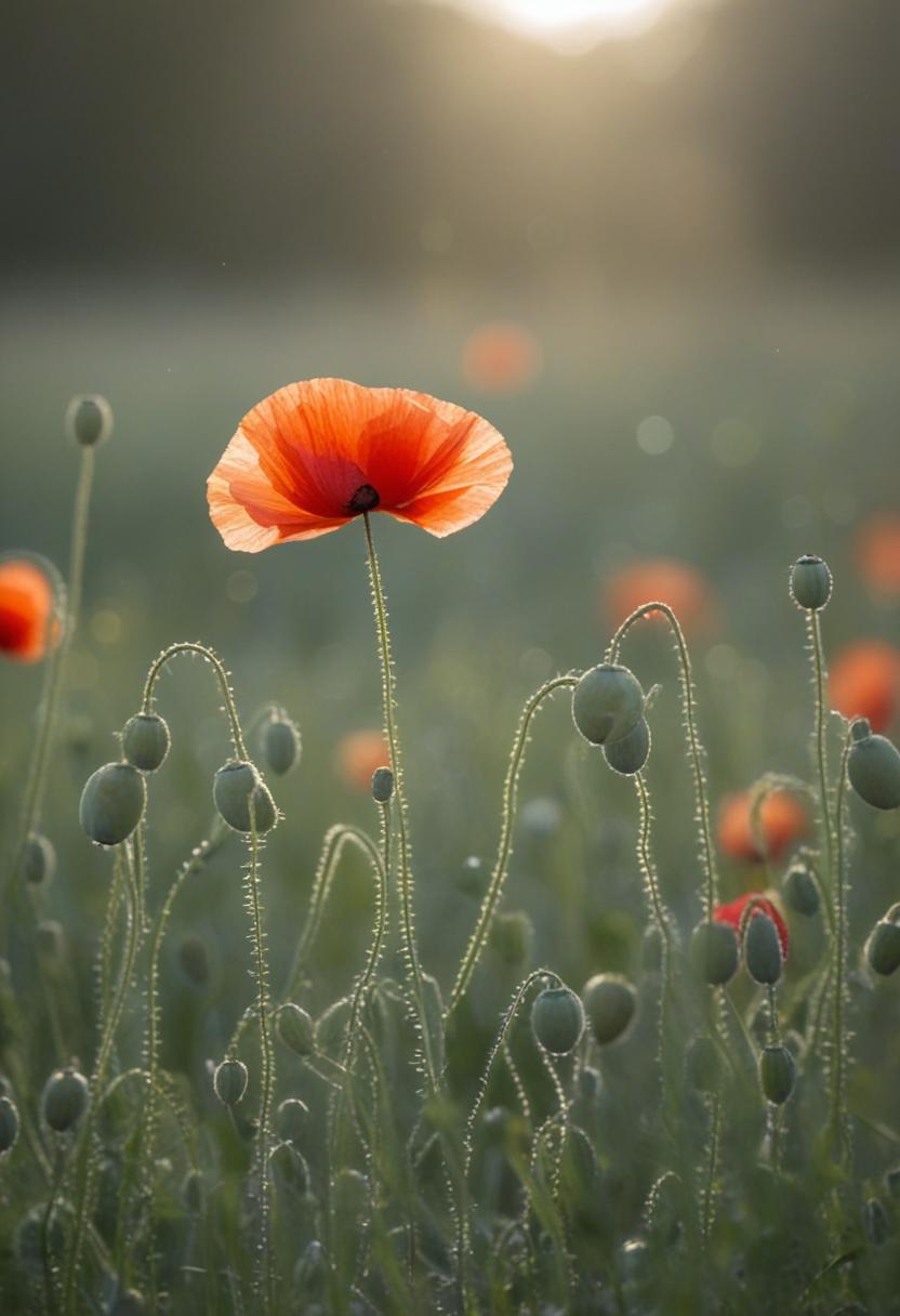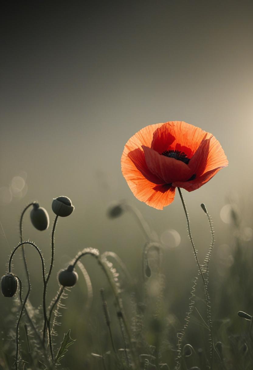 74. A dramatic midshot of a poppy under ethereal backlighting, exuding a dreamy, poetic vibe with soft shadows and a whimsical, artistic atmosphere.