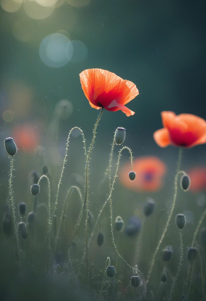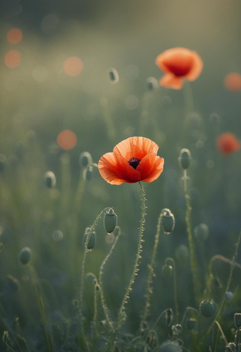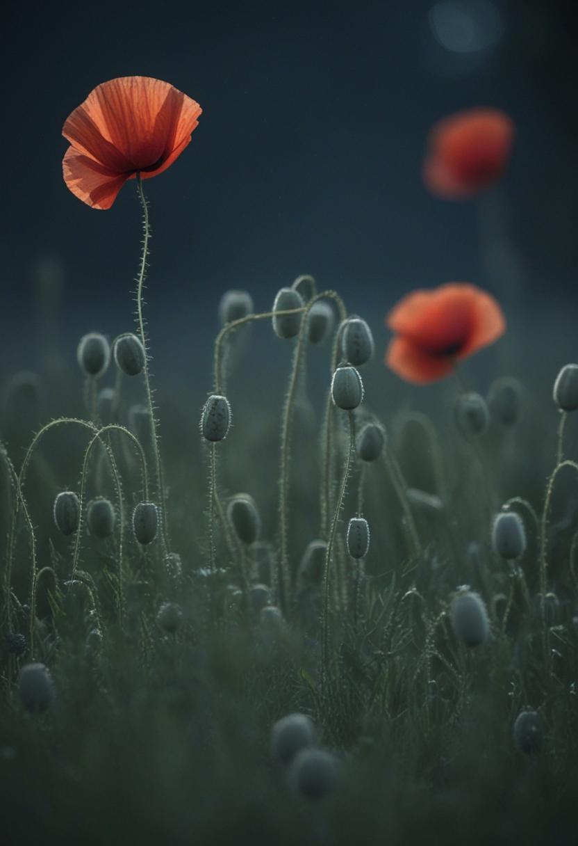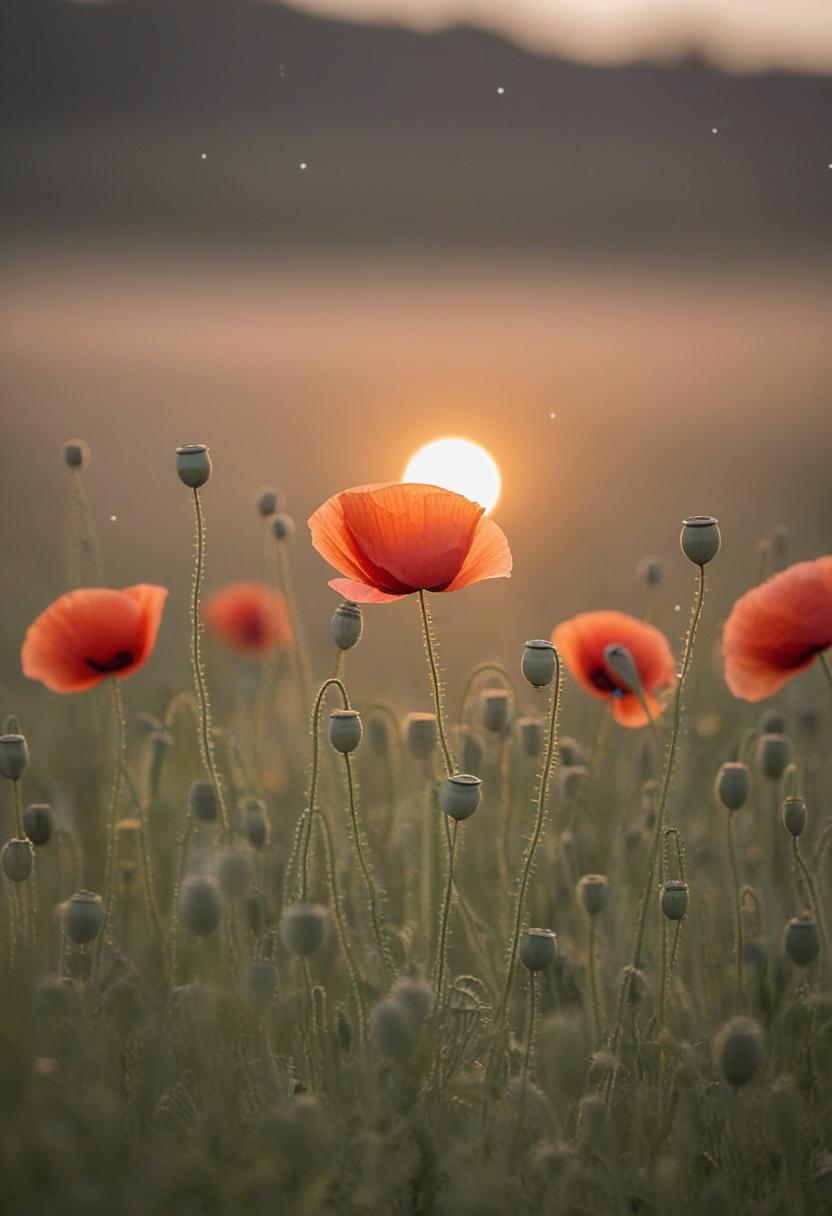 5. A surreal wide-angle shot features a poppy-themed silhouette under soft,梦幻 lighting, evoking a fantasy and artistic poppy aesthetic.