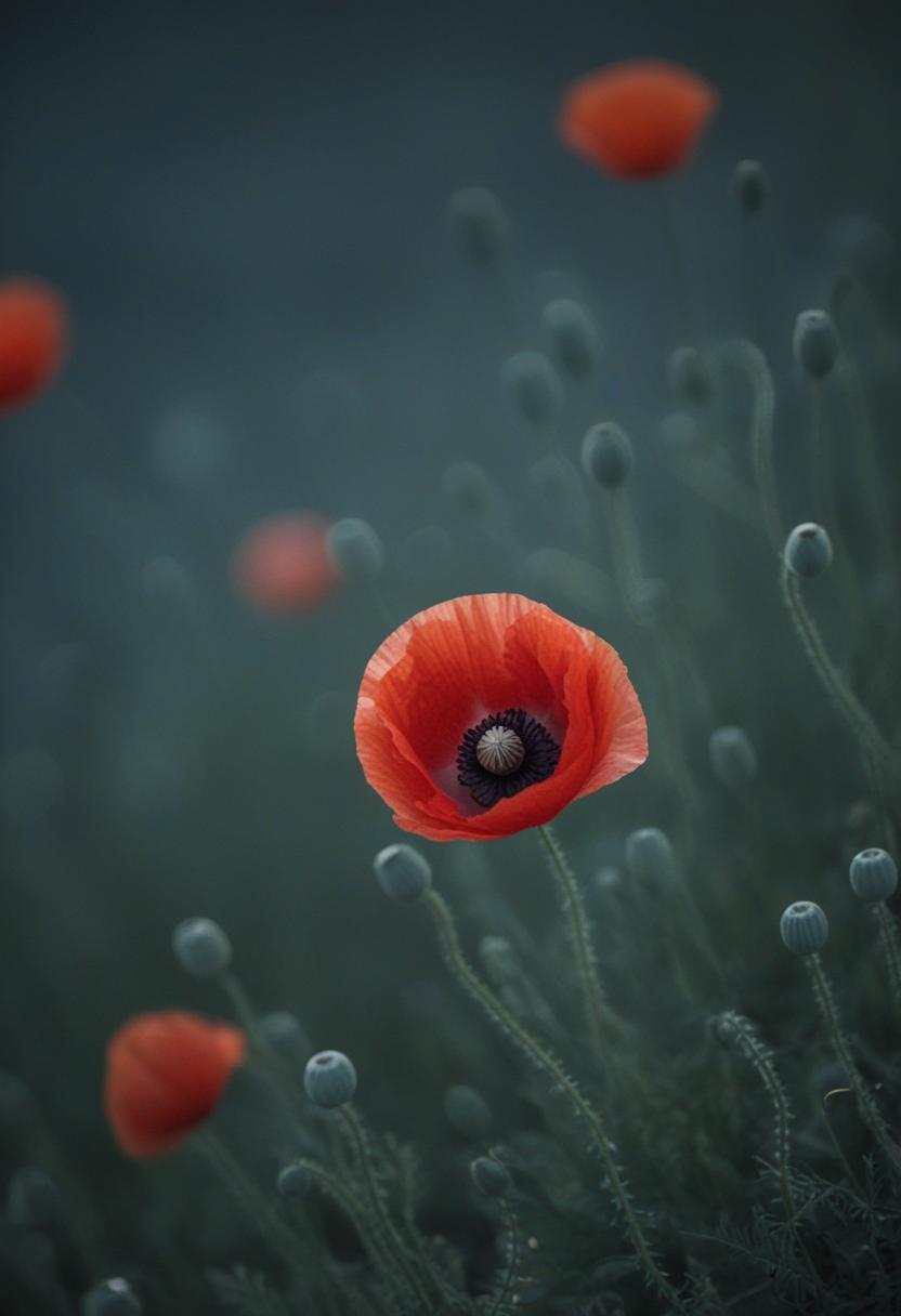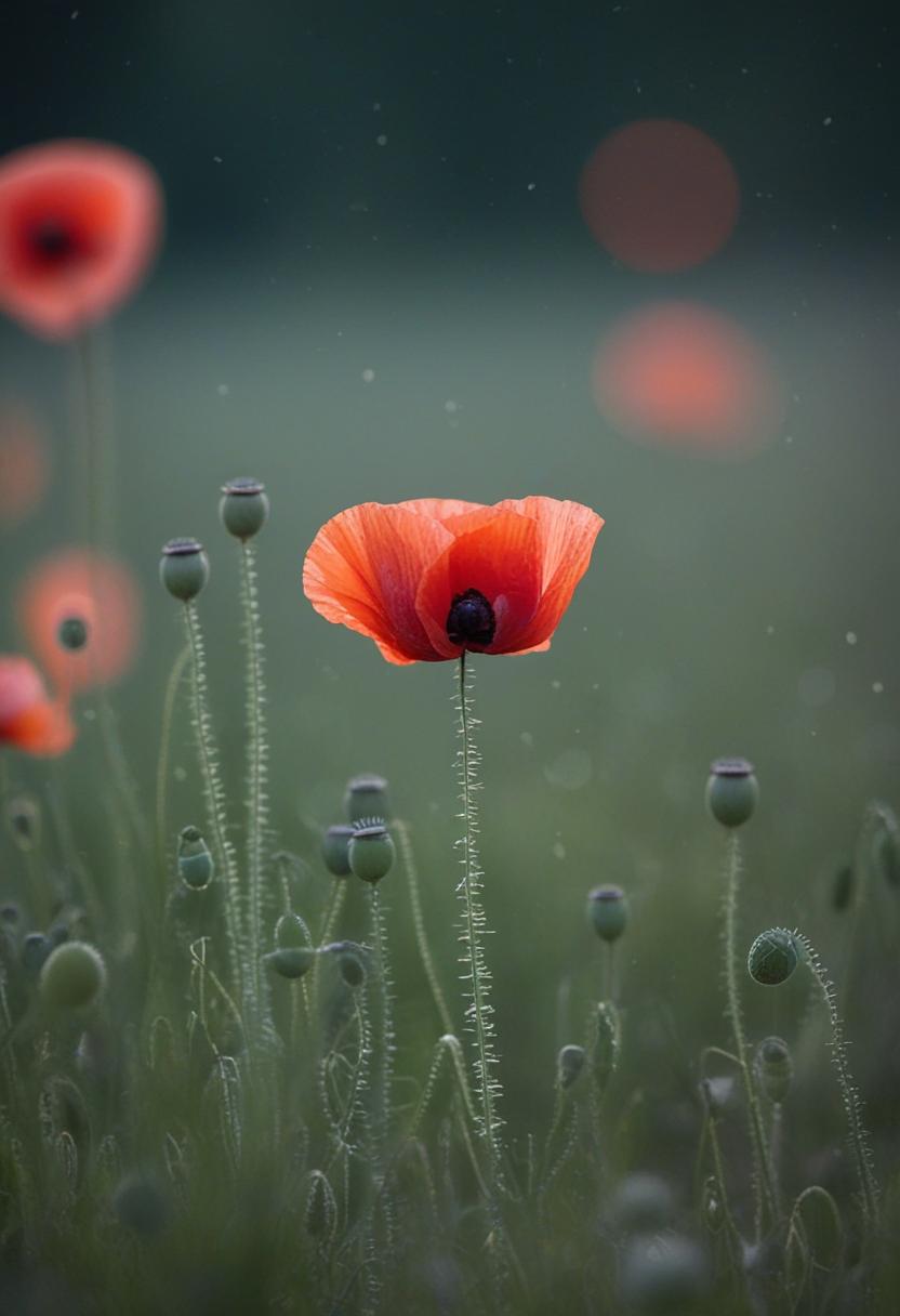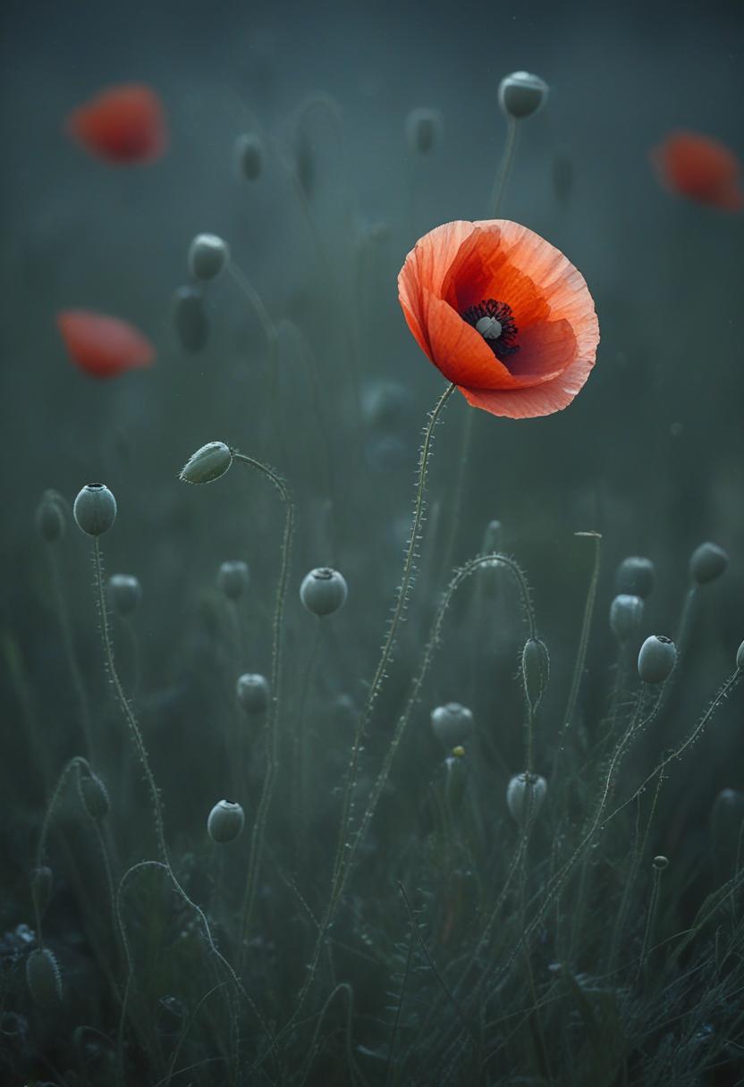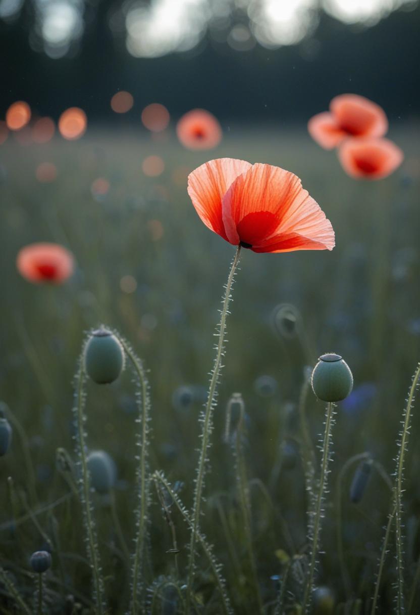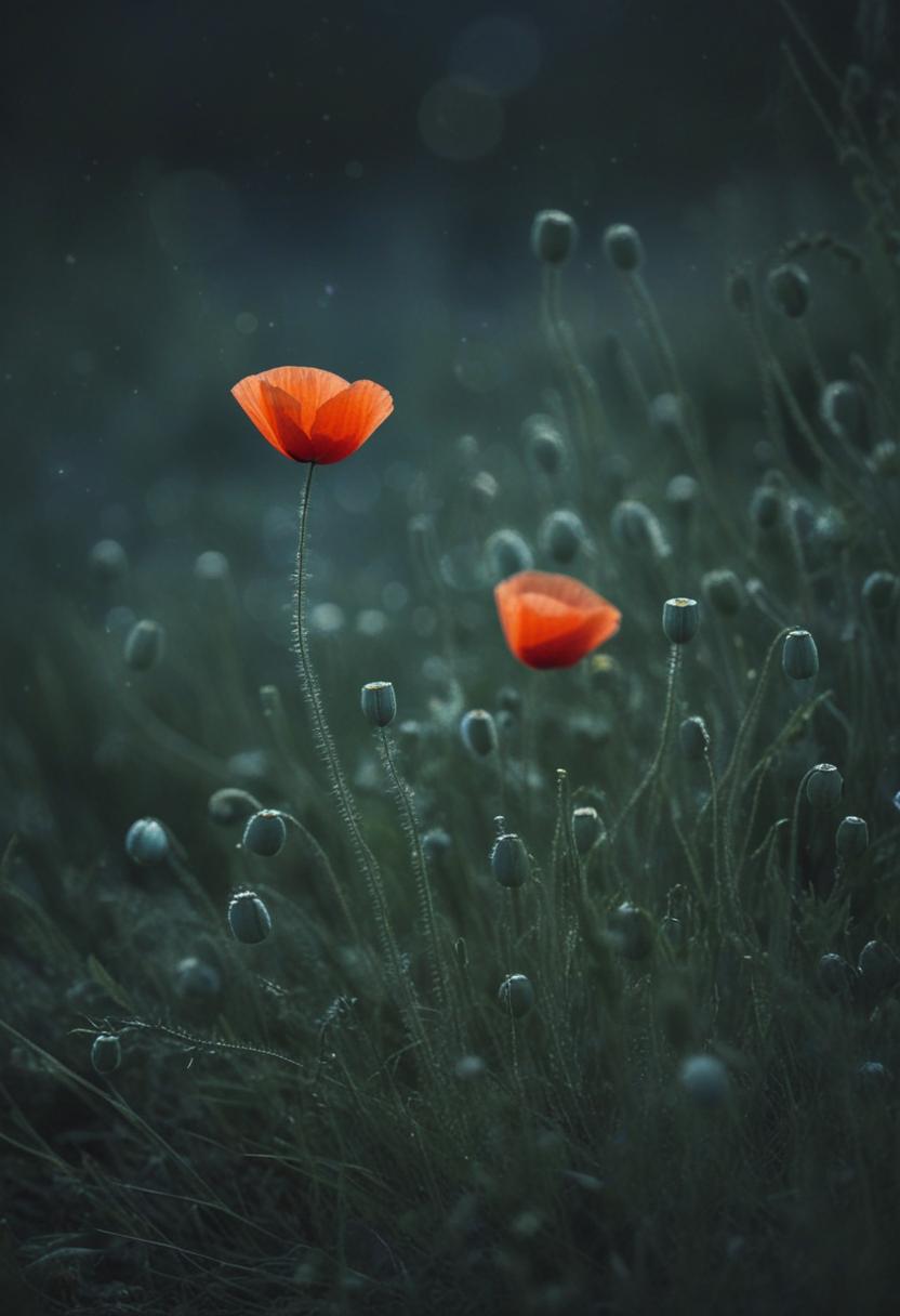 5. A surreal wide-angle shot features a poppy-themed silhouette under soft,梦幻 lighting, evoking a fantasy and artistic poppy aesthetic.