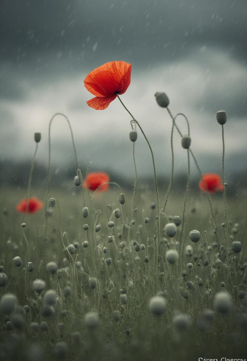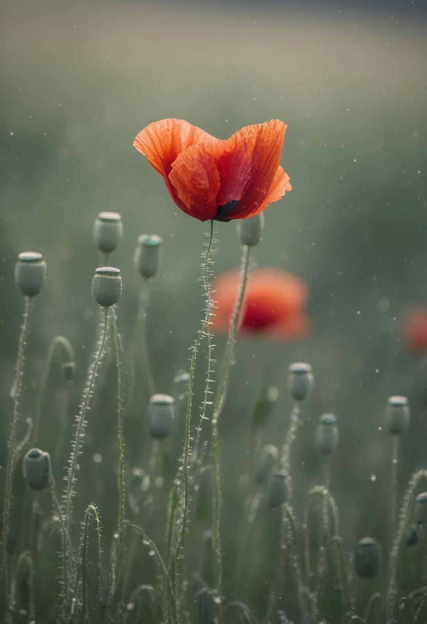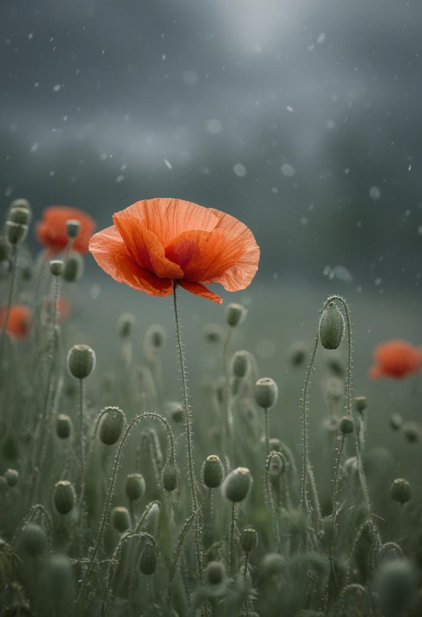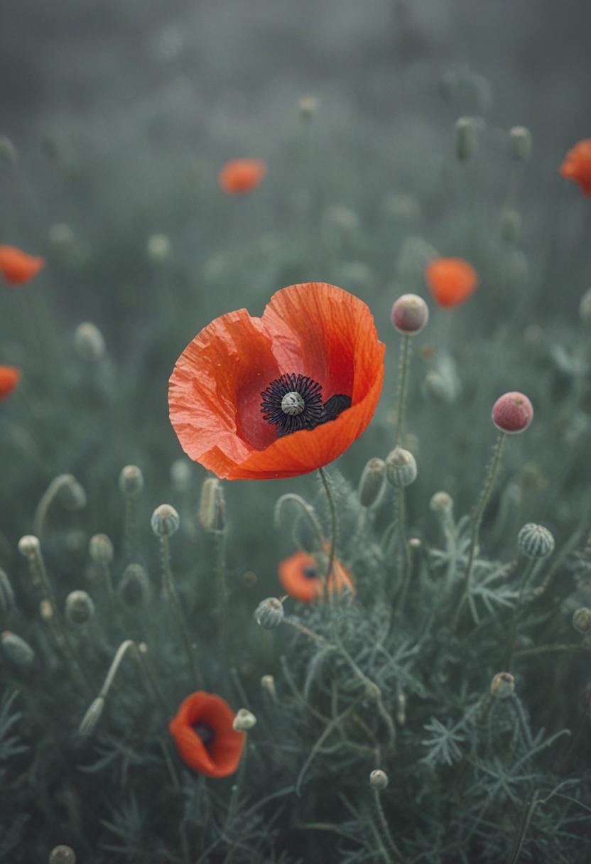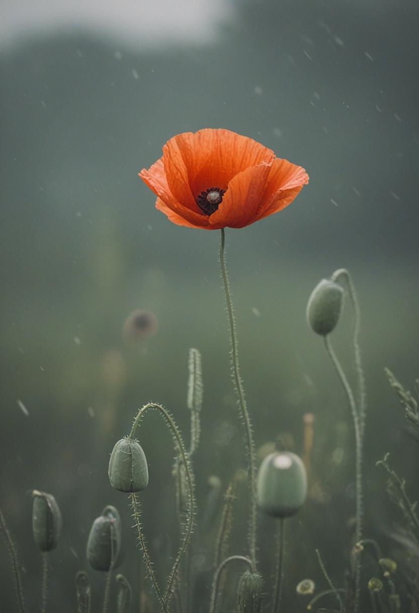 8. A midshot of a vibrant poppy against a cloudy, overcast sky, exuding a soft, dreamy poppy aesthetic.