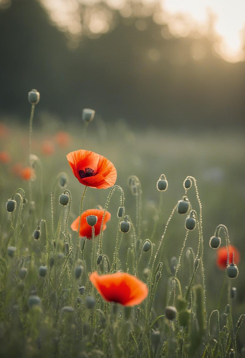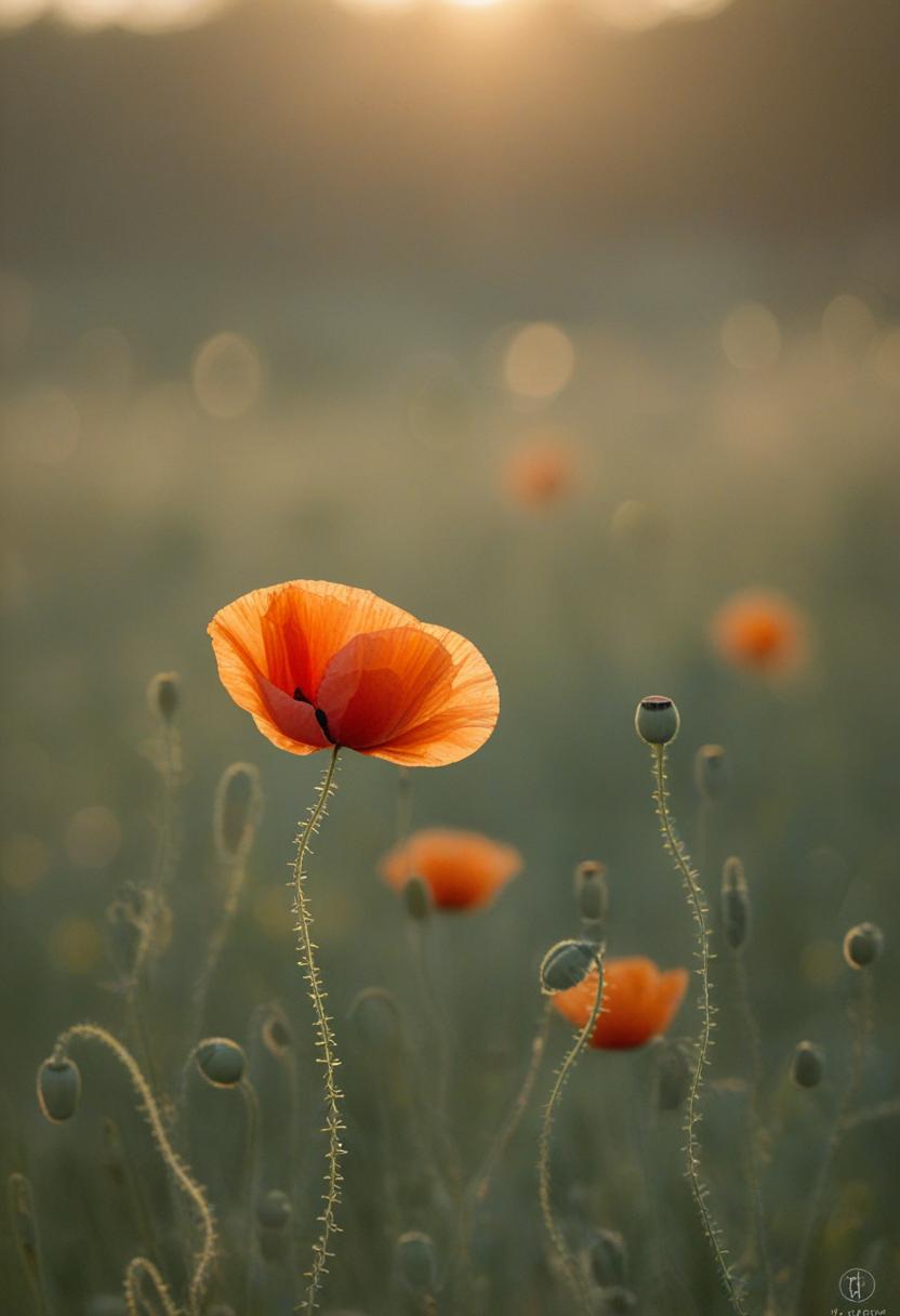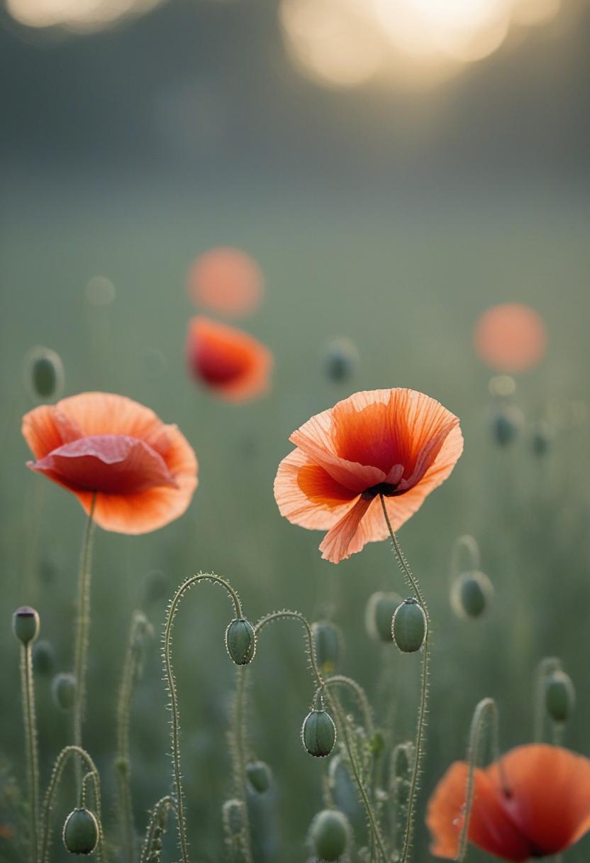 27. A soft morning light bathes a lively midshot of a poppy aesthetic, capturing gentle warmth and vibrant energy in a serene, artistic moment.