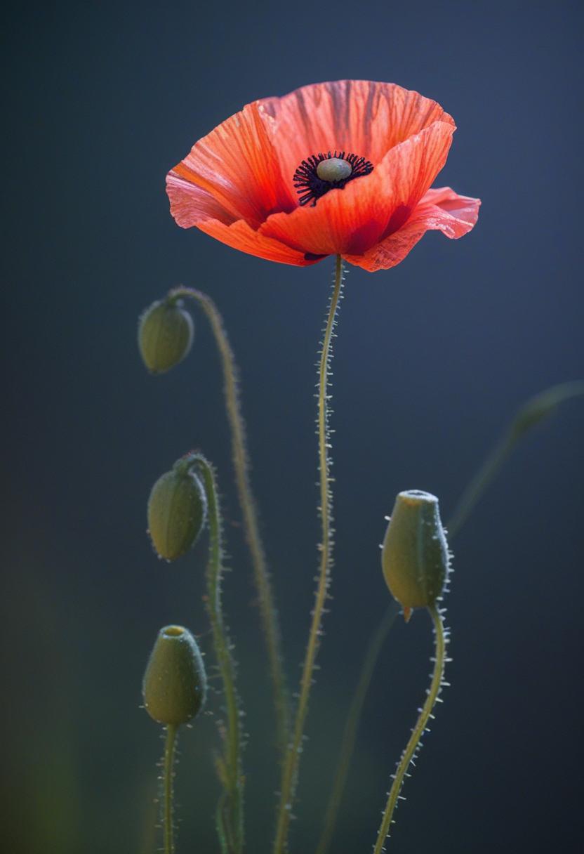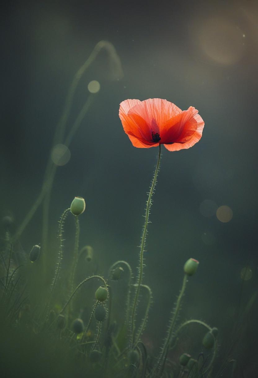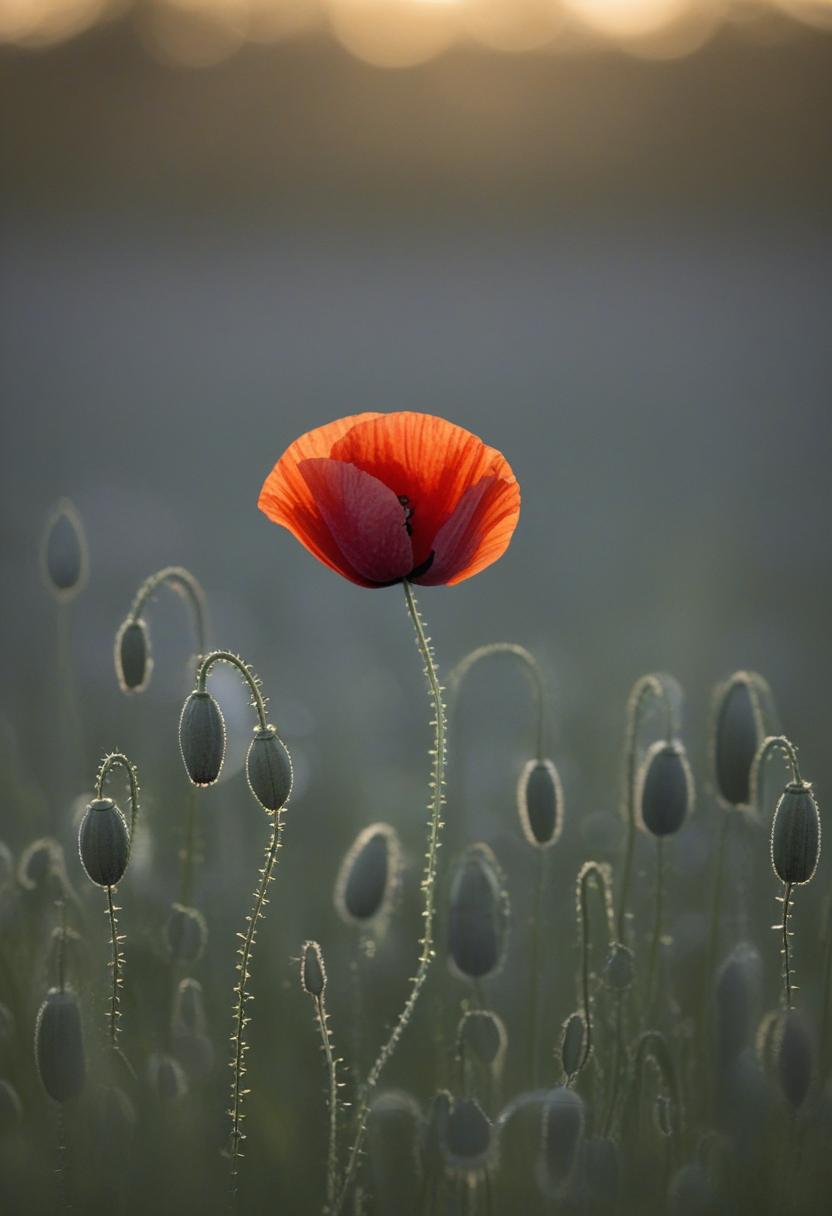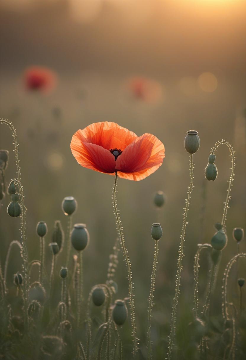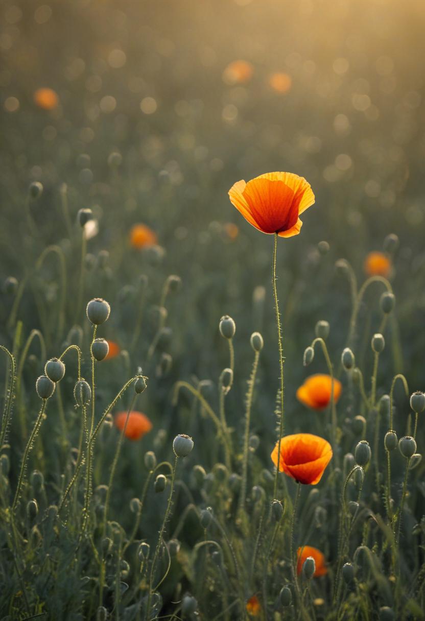 99. A dramatic midshot of a poppy under soft, glowing backlighting, exuding a dreamy, ethereal poppy aesthetic.