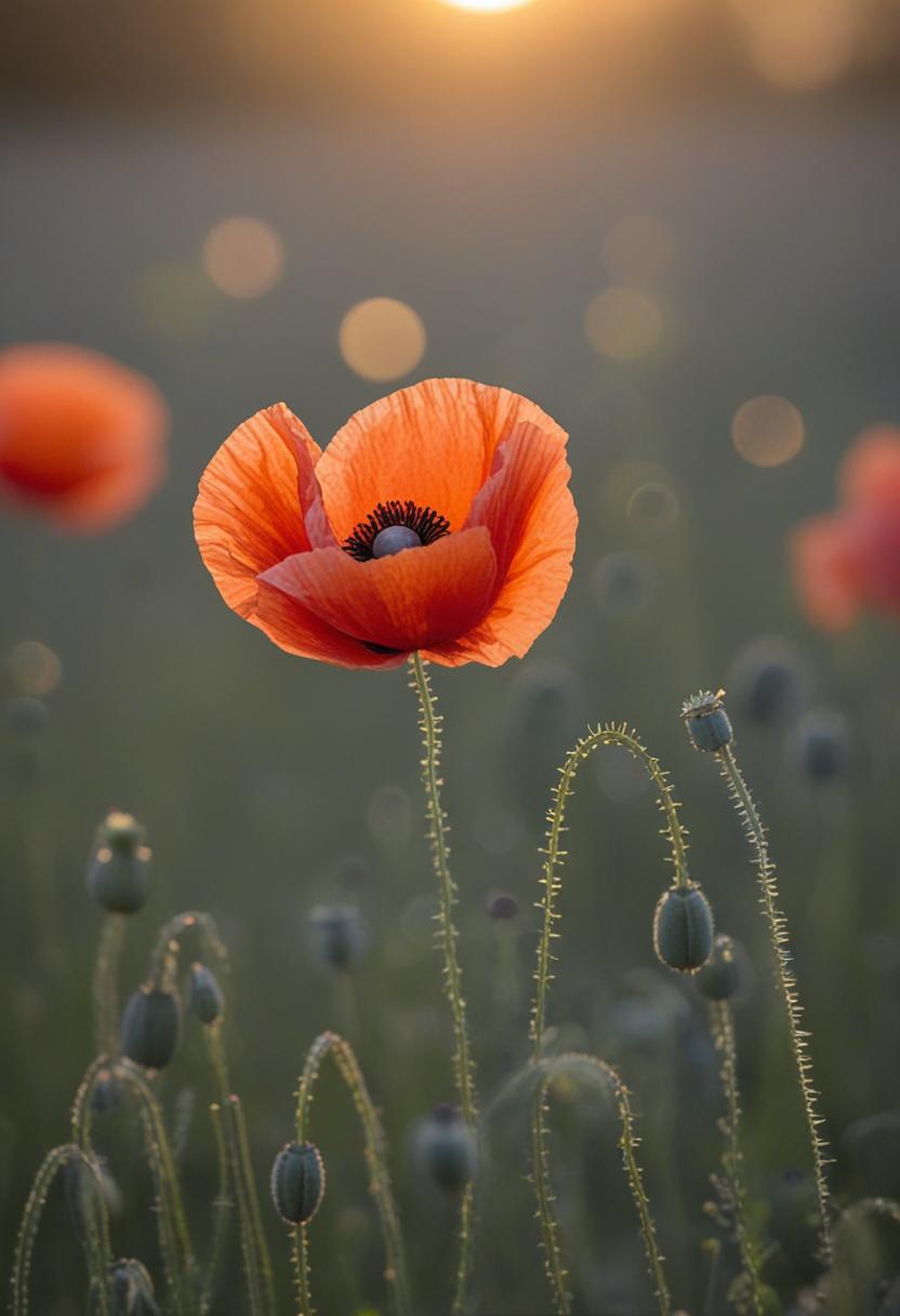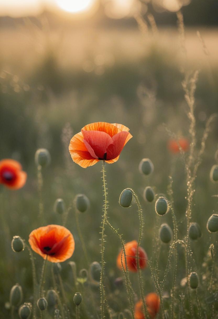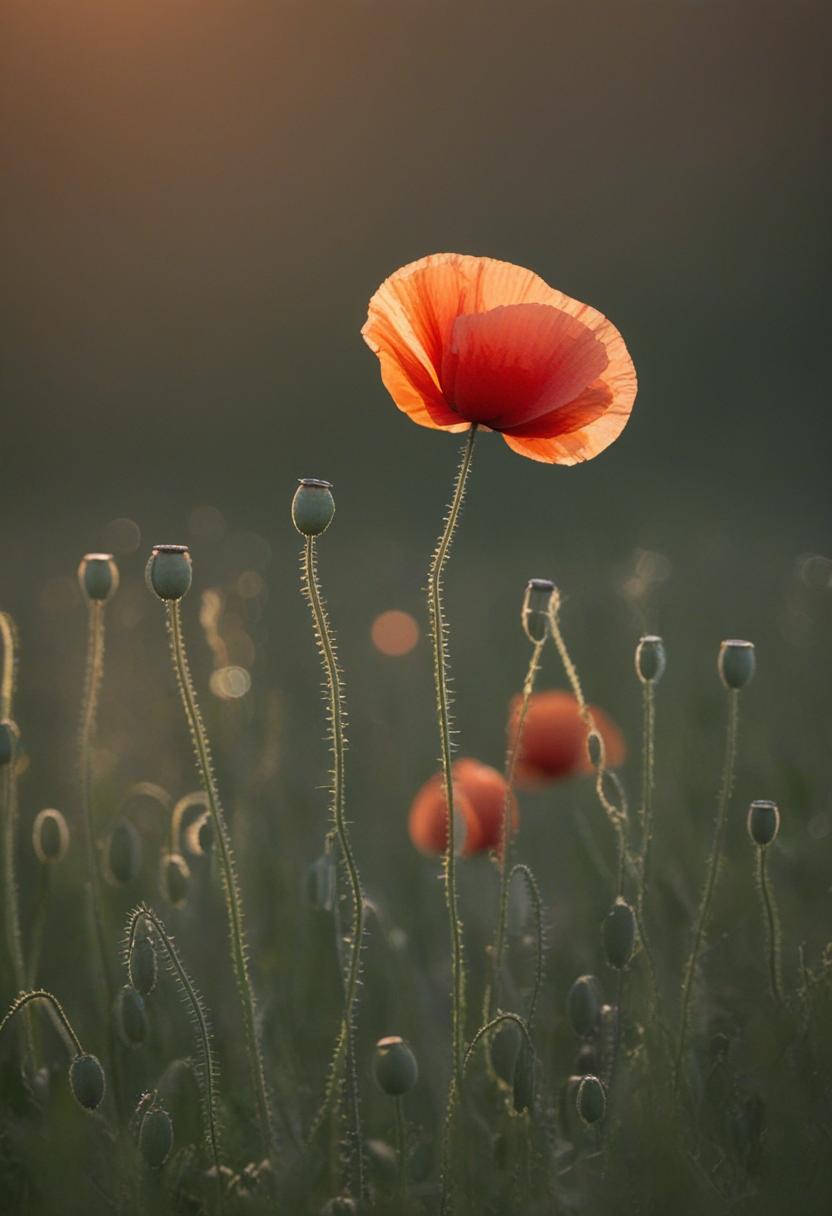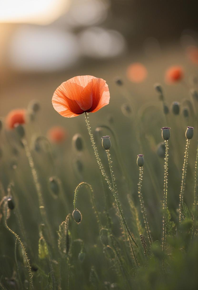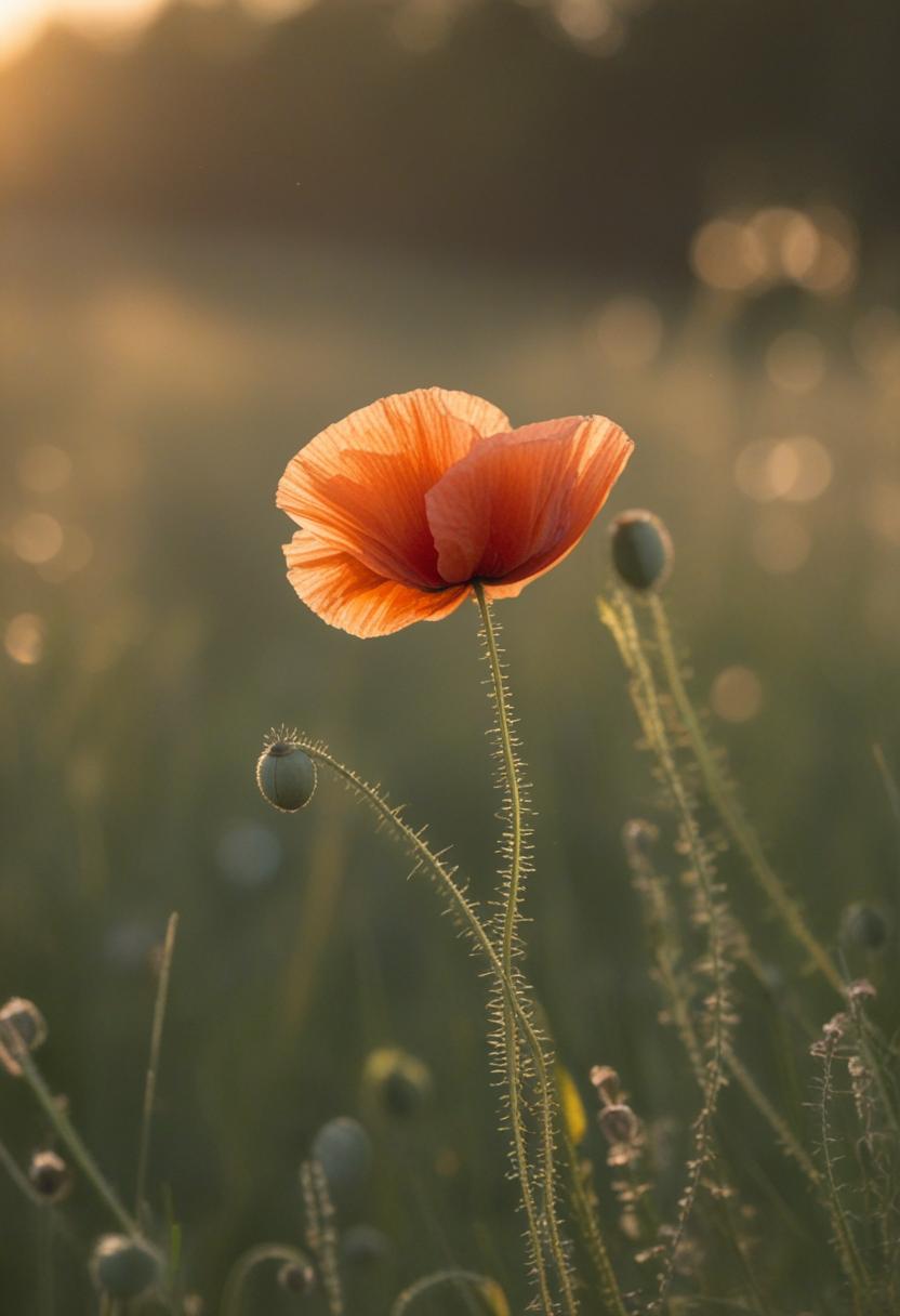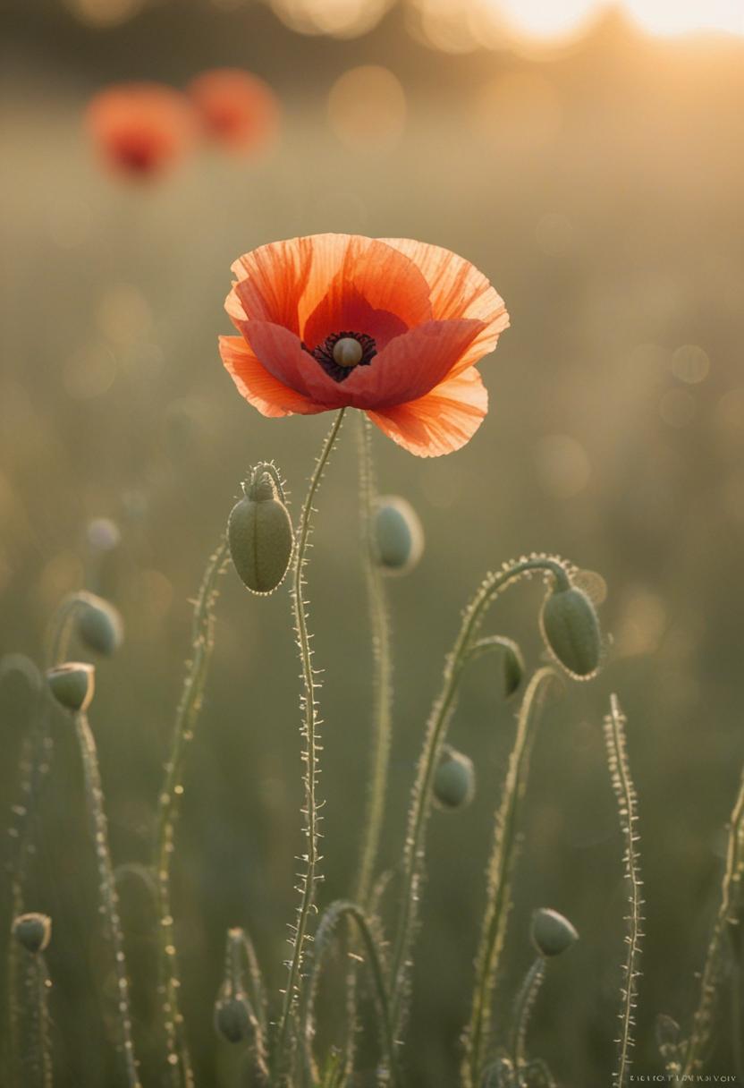 10. A cozy close-up of a poppy in golden hour light, soft and warm, evoking a serene, dreamy poppy aesthetic.