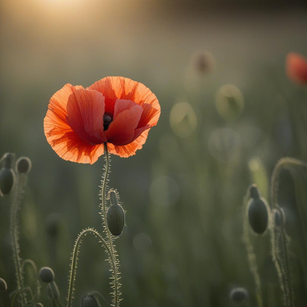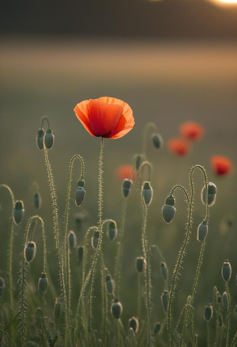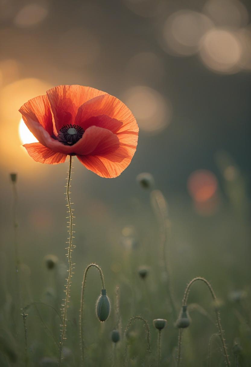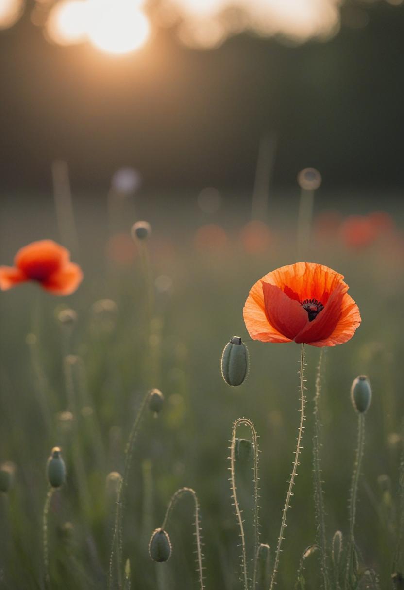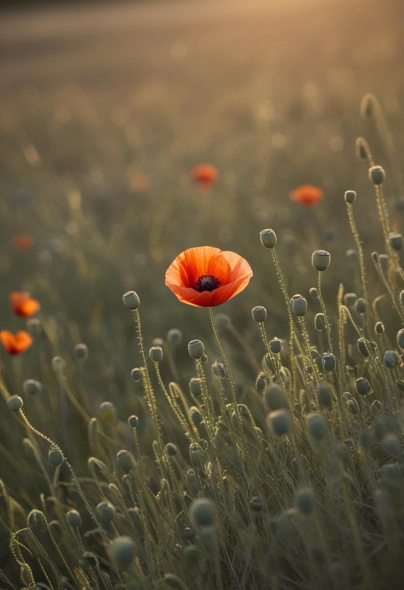 10. A cozy close-up of a poppy in golden hour light, soft and warm, evoking a serene, dreamy poppy aesthetic.