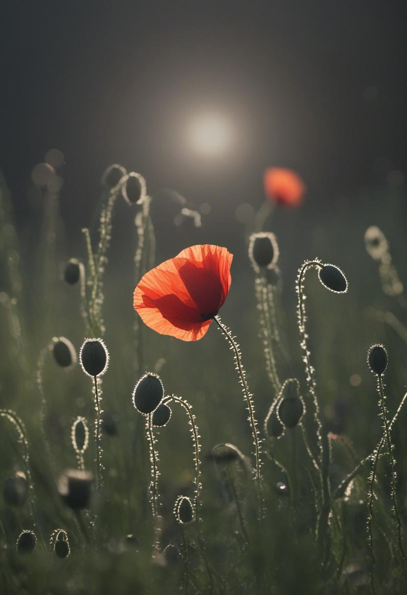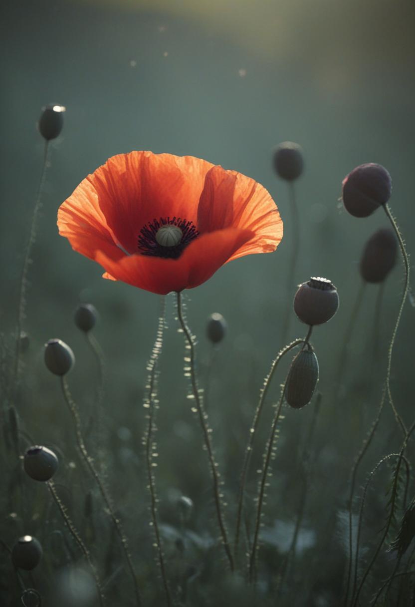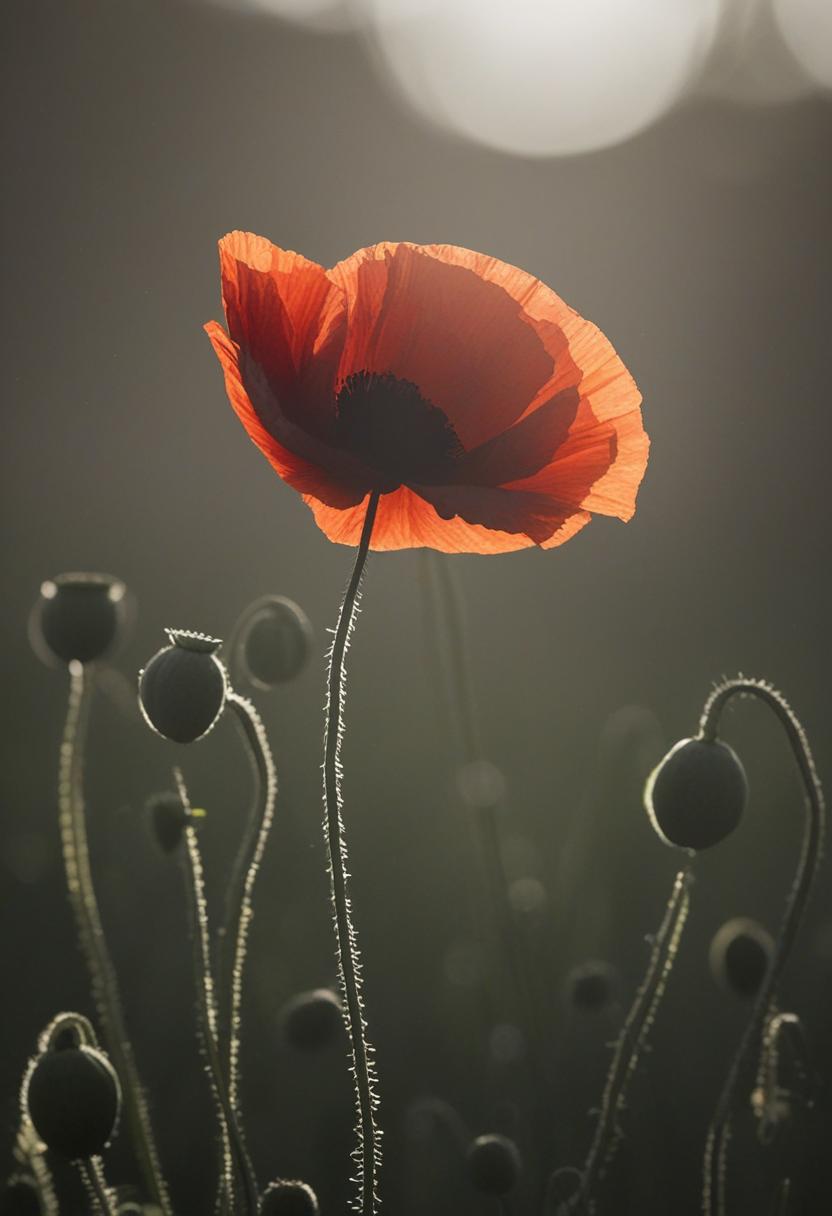 100. A dramatic midshot of a poppy under surreal, backlighting, evoking a dreamlike, ethereal poppy aesthetic.
