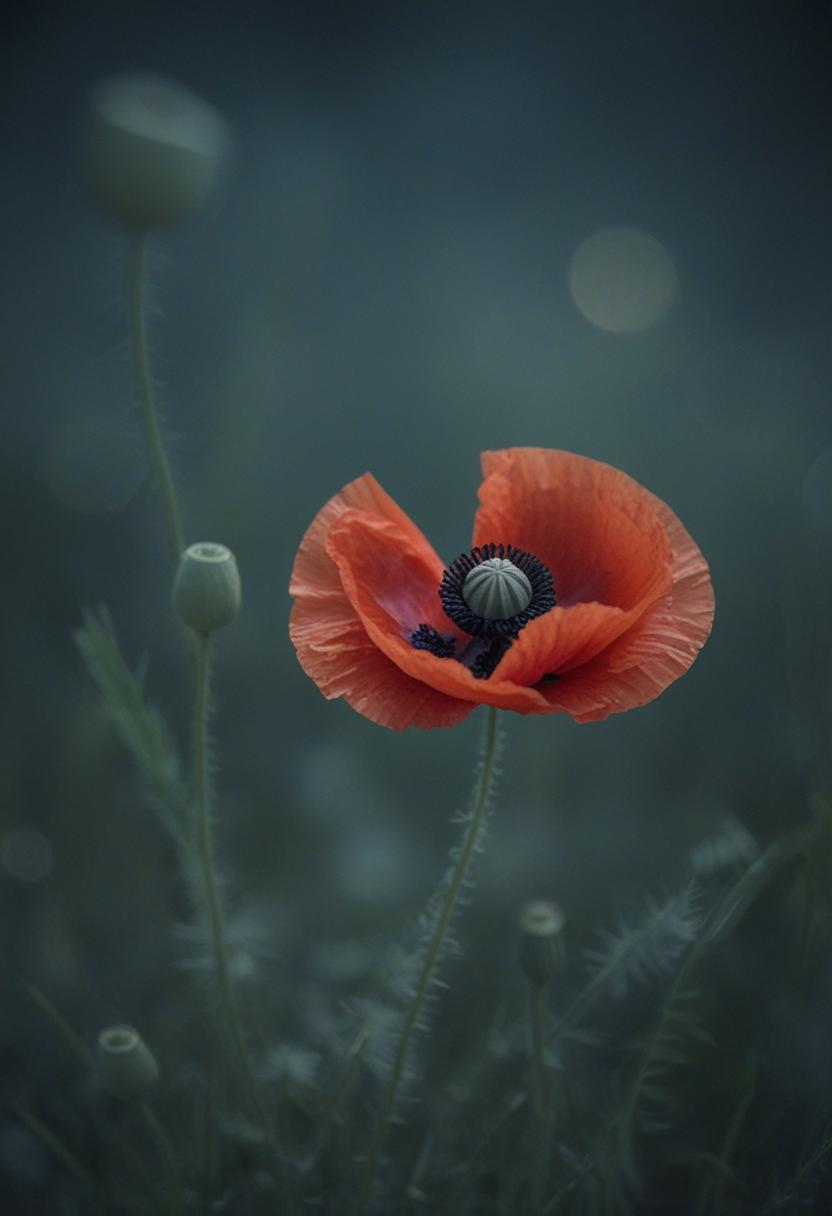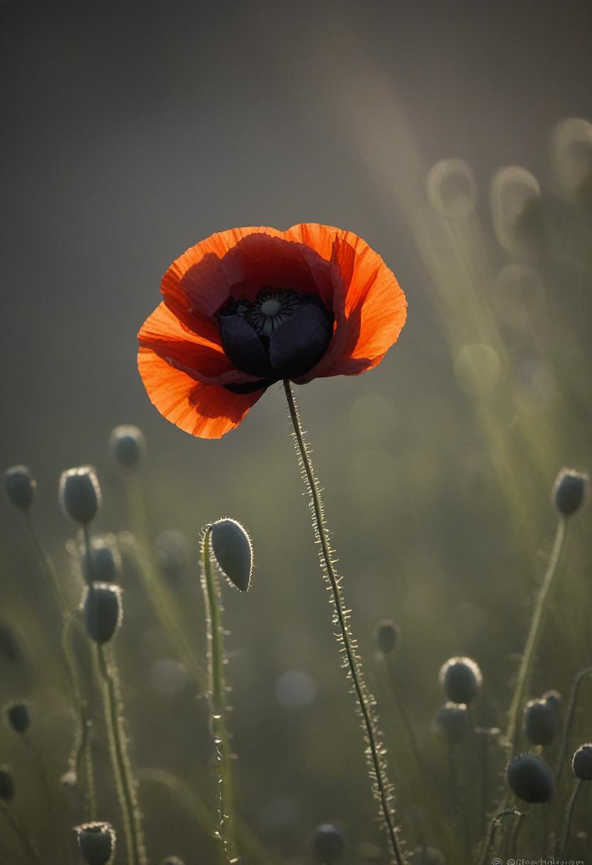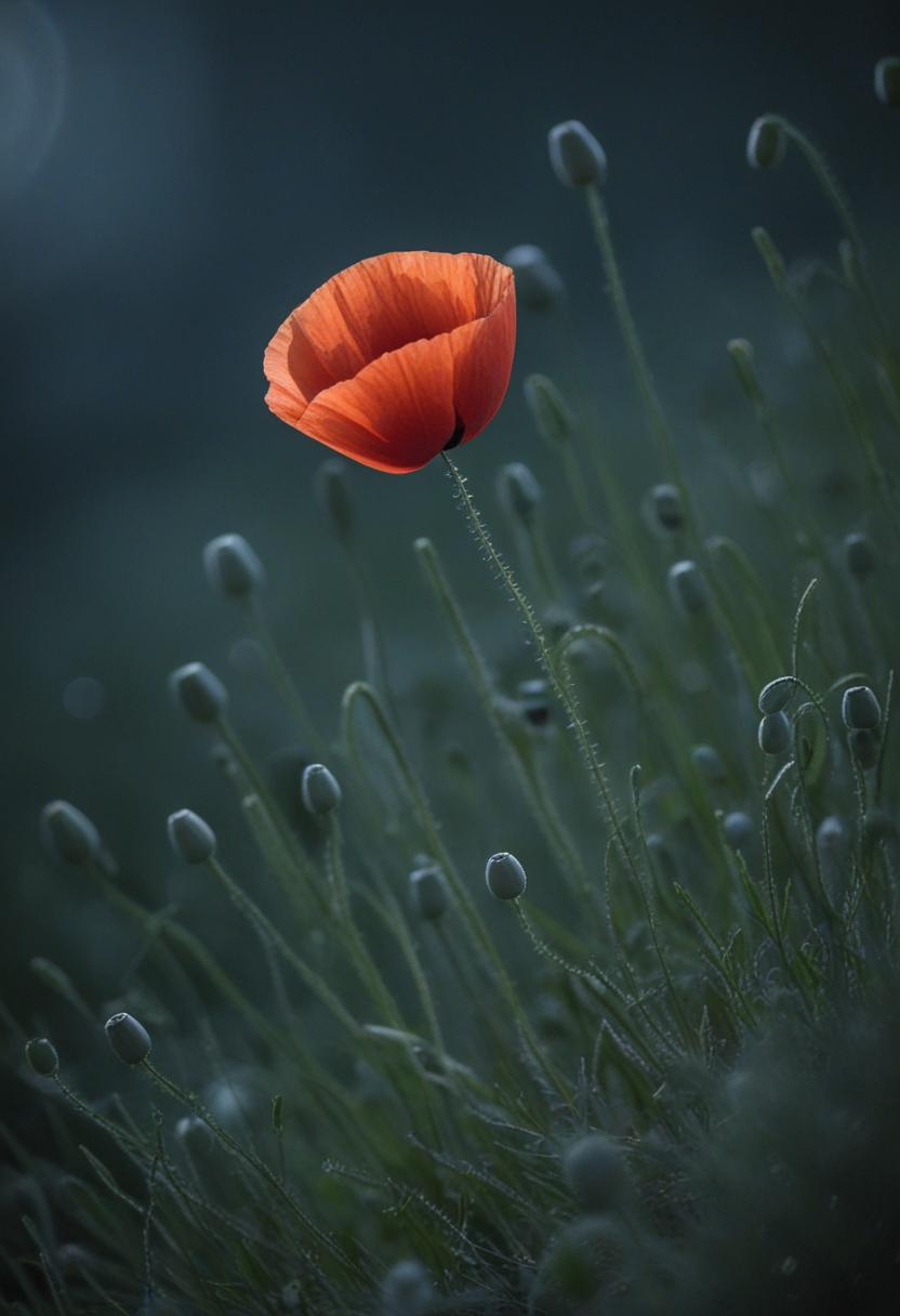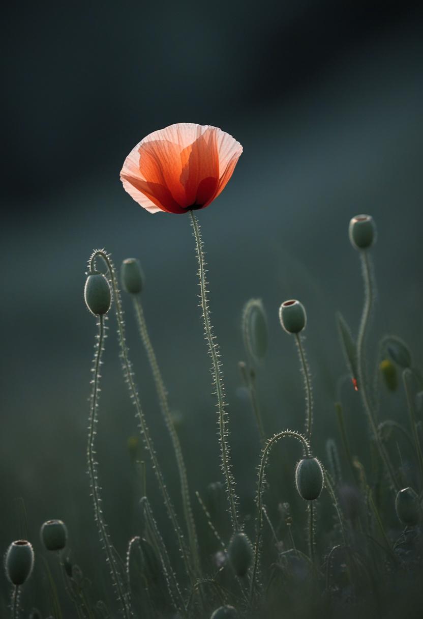 100. A dramatic midshot of a poppy under surreal, backlighting, evoking a dreamlike, ethereal poppy aesthetic.