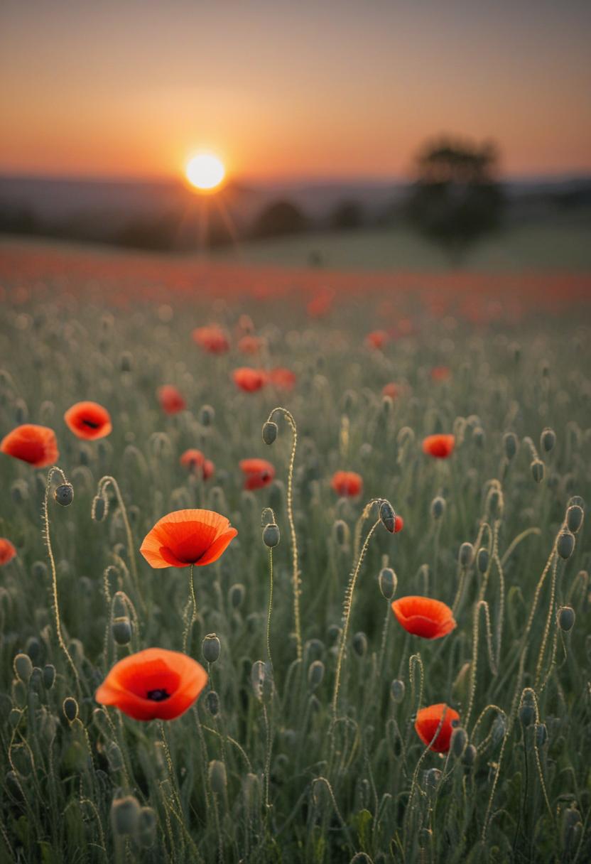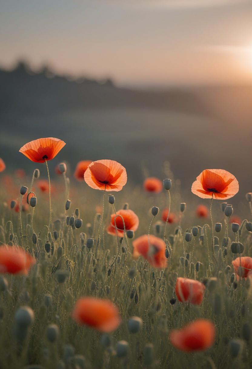 23. A dreamy sunset over a scenic poppy field, glowing with warm hues and soft light, evoking a serene and romantic poppy aesthetic.