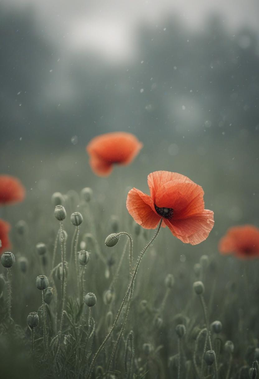97. A dreamy poppy-themed scene with a cloudy, overcast sky, set in a fantasy style using elegant fonts. Soft hues and ethereal lighting create a mystical, whimsical atmosphere.