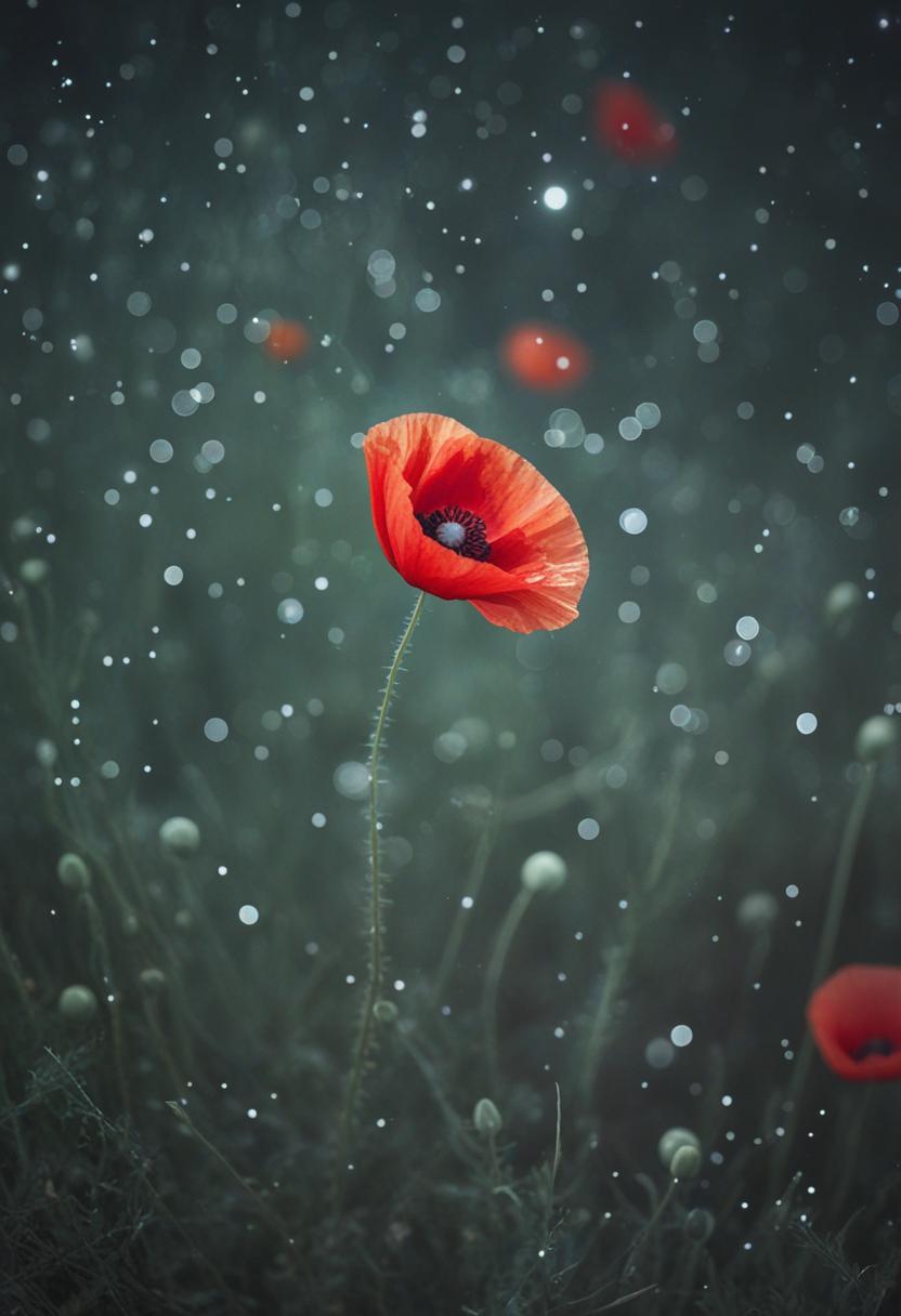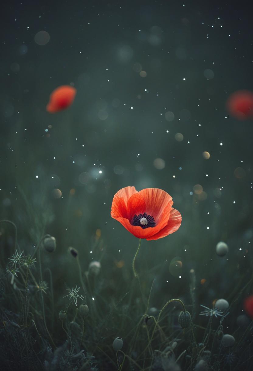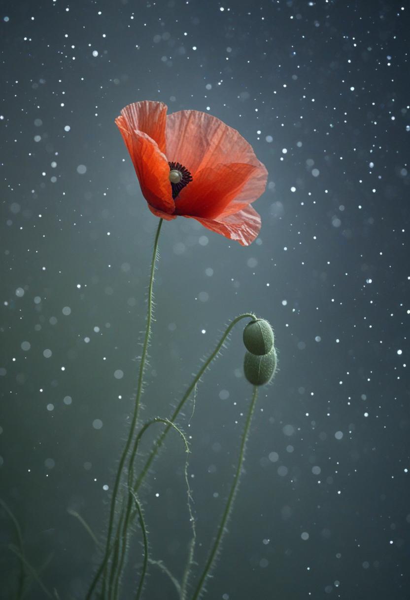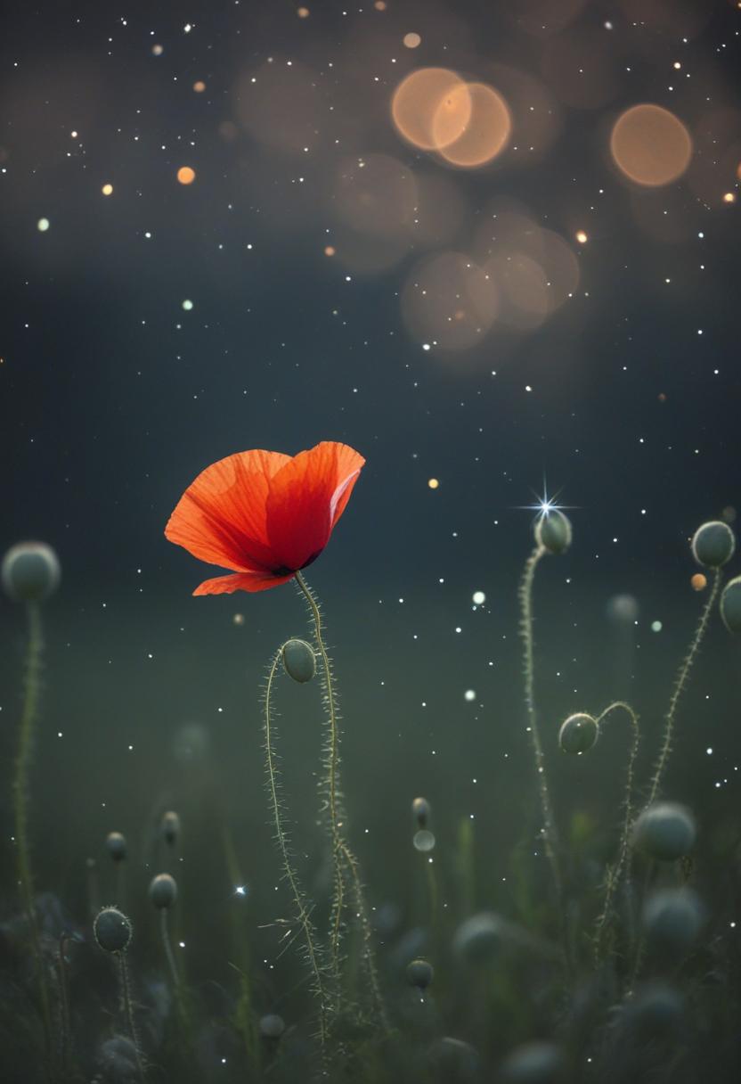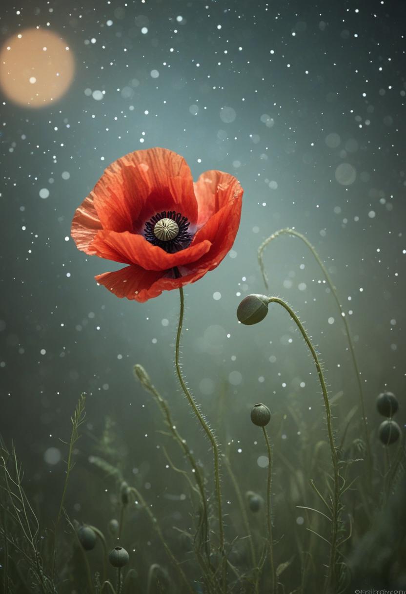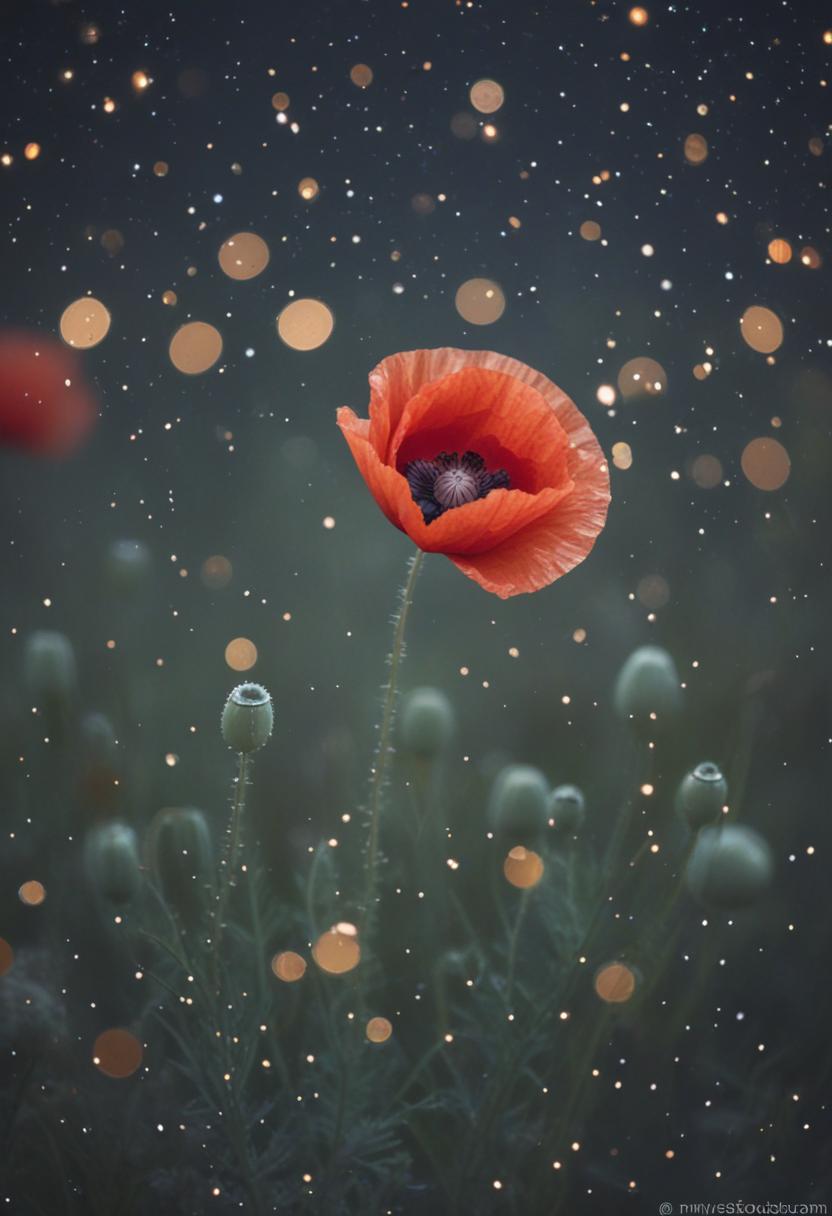 51. A serene studio shot of a poppy in soft light, exuding a dreamy, ethereal poppy aesthetic with starry accents.