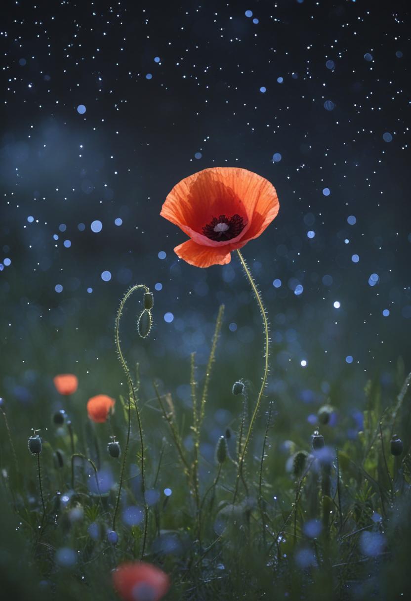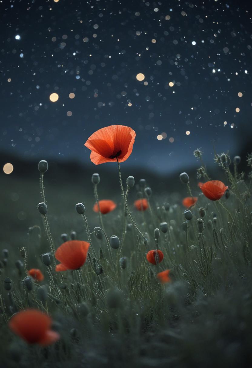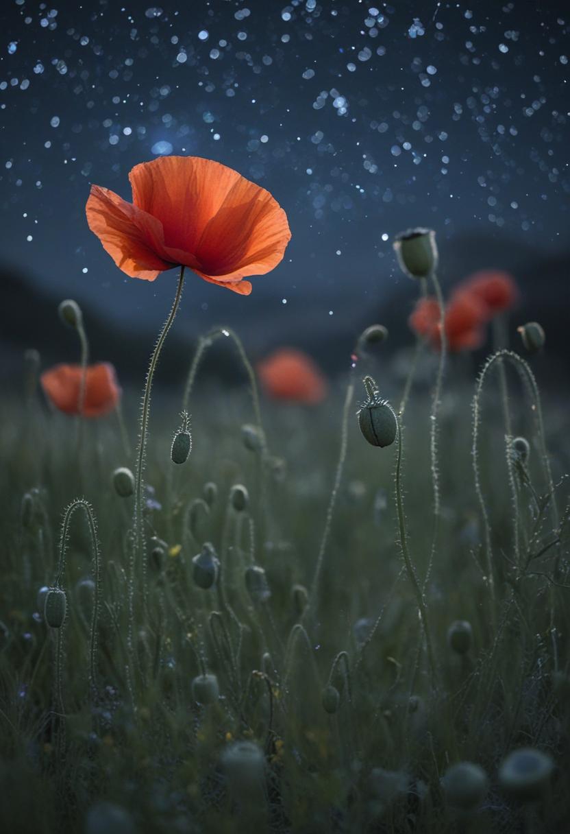 76. A serene, poppy-inspired scene under starry skies, blending soft hues and dreamy light to create a cinematic, scenic, and ethereal atmosphere.