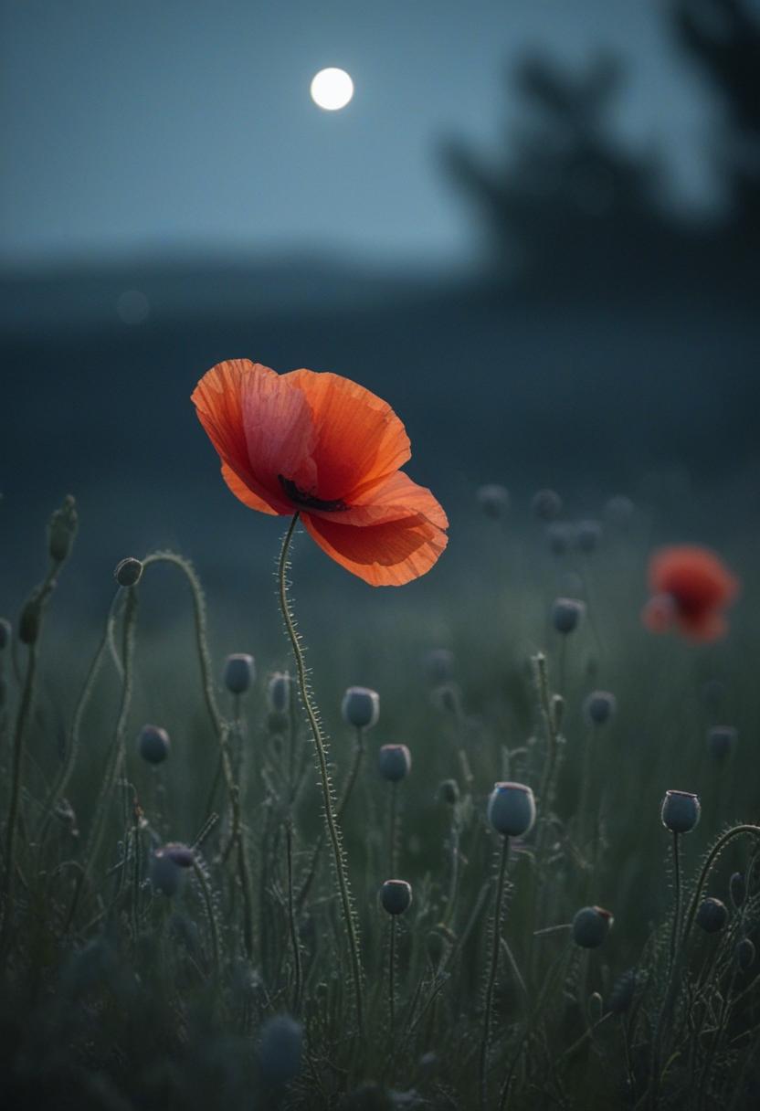 93. A serene moonlit scene with a poppy in focus, bathed in soft light. Peaceful and elegant, capturing a tranquil, top-down view of nature's beauty under the stars.