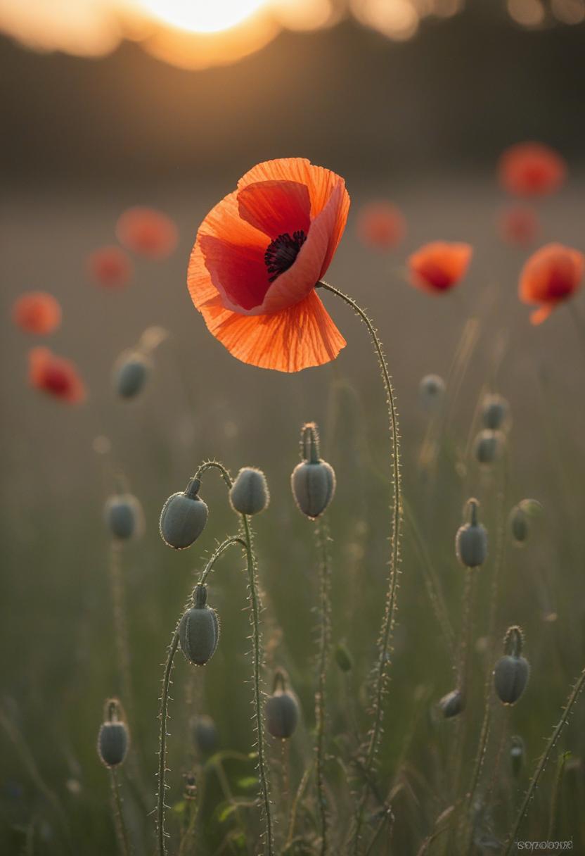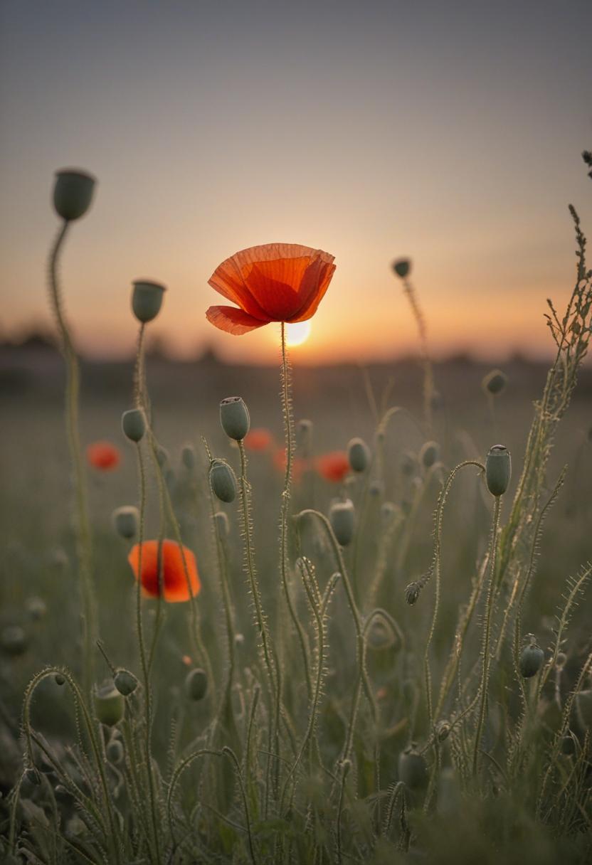 52. A dramatic close-up of a poppy in a sunset glow, with vibrant colors and soft shadows, capturing the beauty of nature under a vivid, romantic sky.