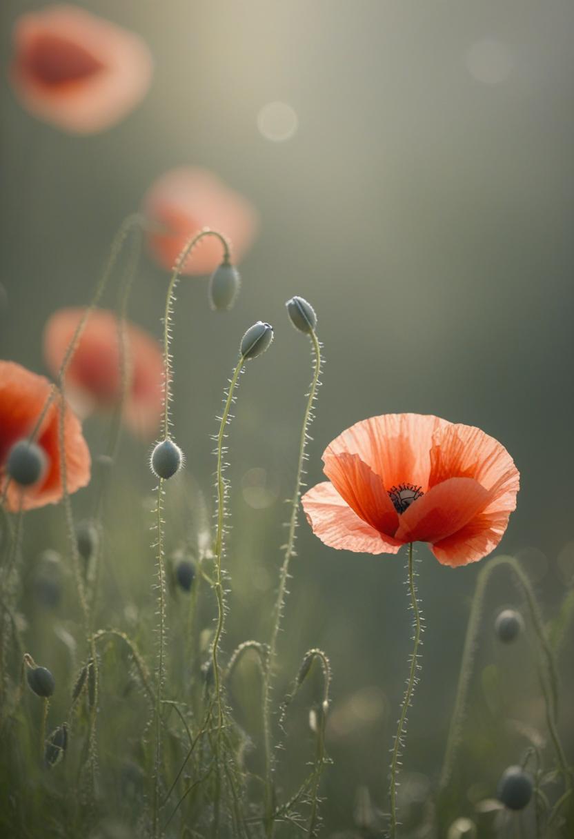 47. A soft, surreal midshot under gentle morning light, capturing the delicate beauty of a poppy in a dreamlike, ethereal setting.