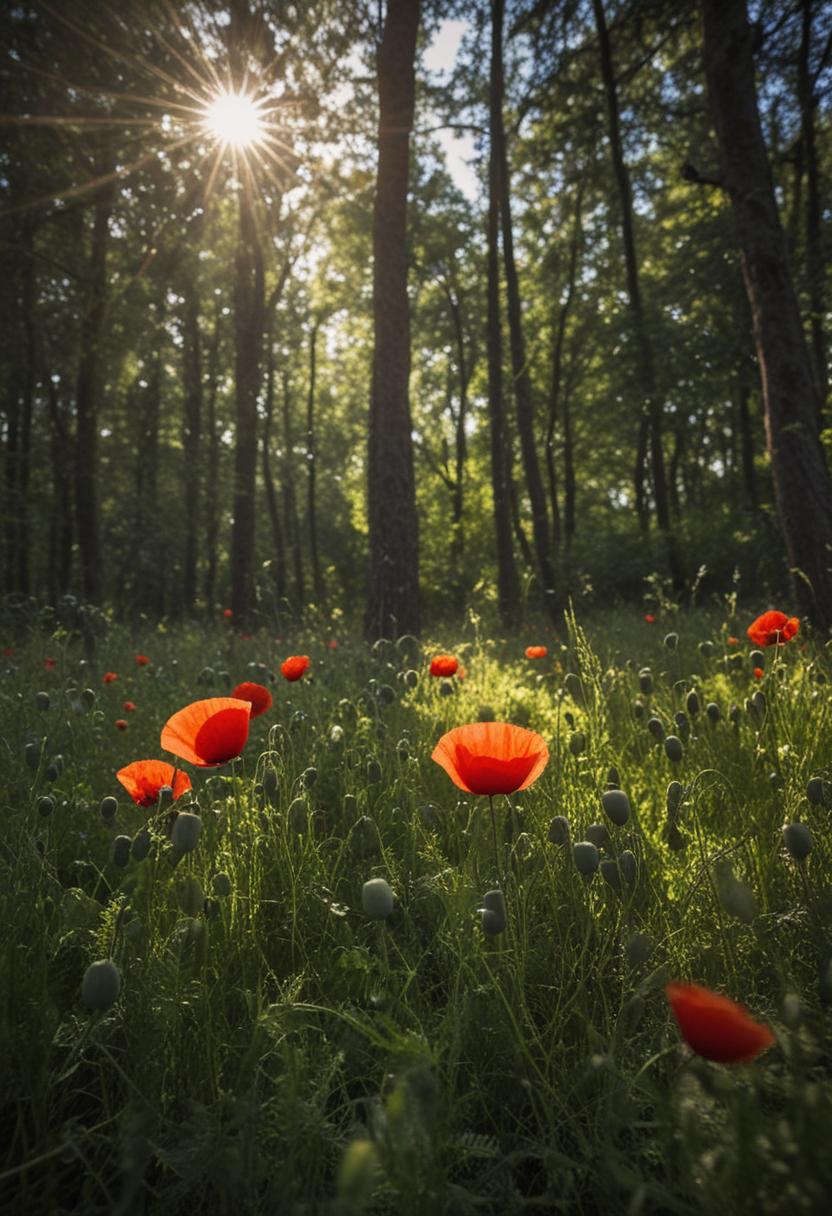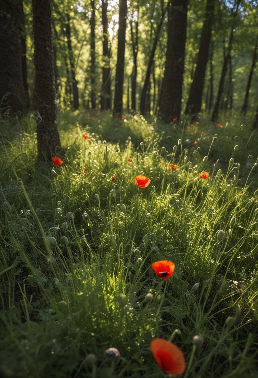 17. A dramatic wide-angle shot of a dappled forest bathed in soft poppy light, creating a dreamy, ethereal poppy aesthetic.