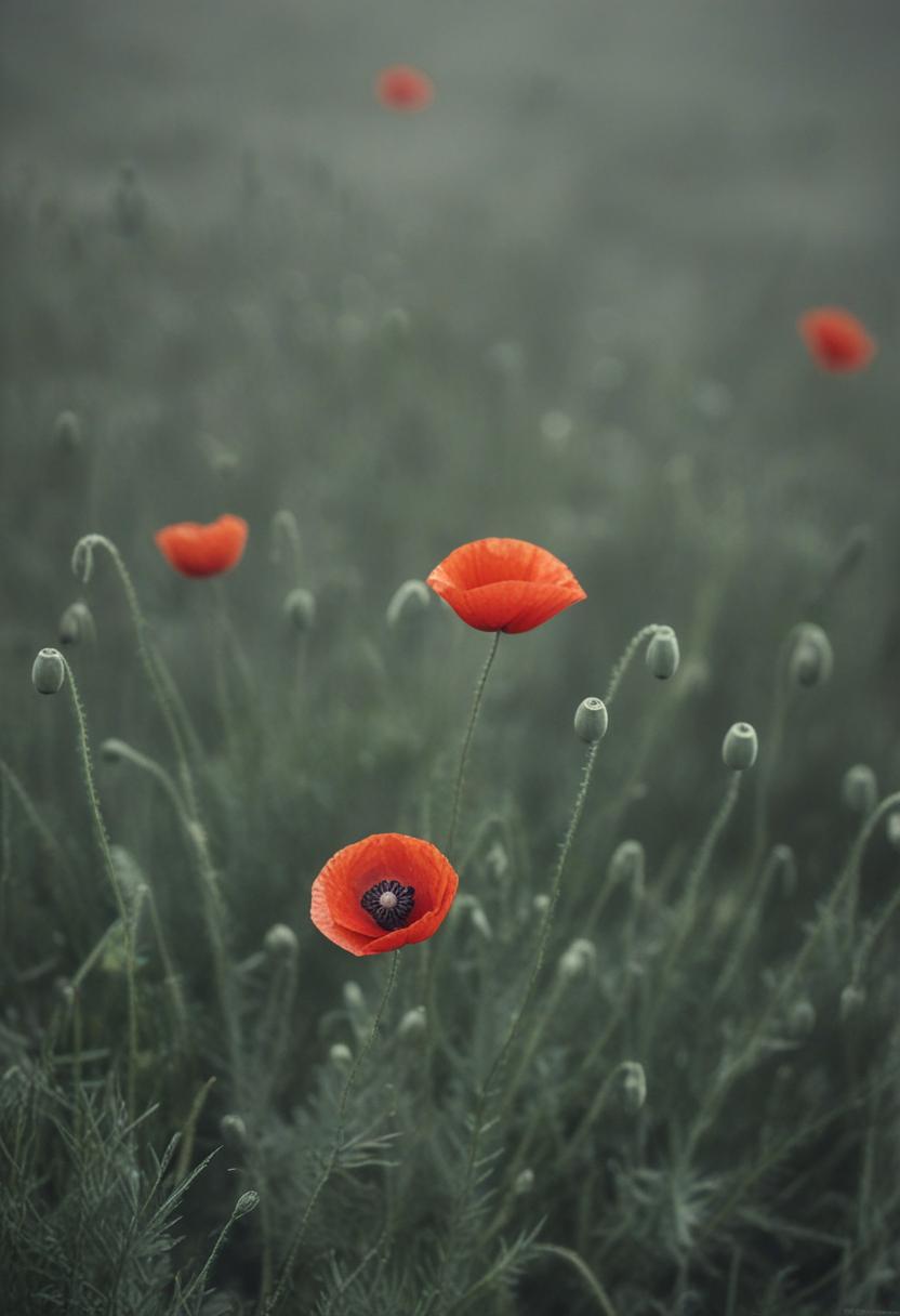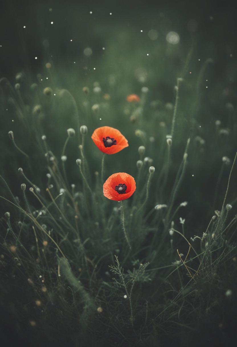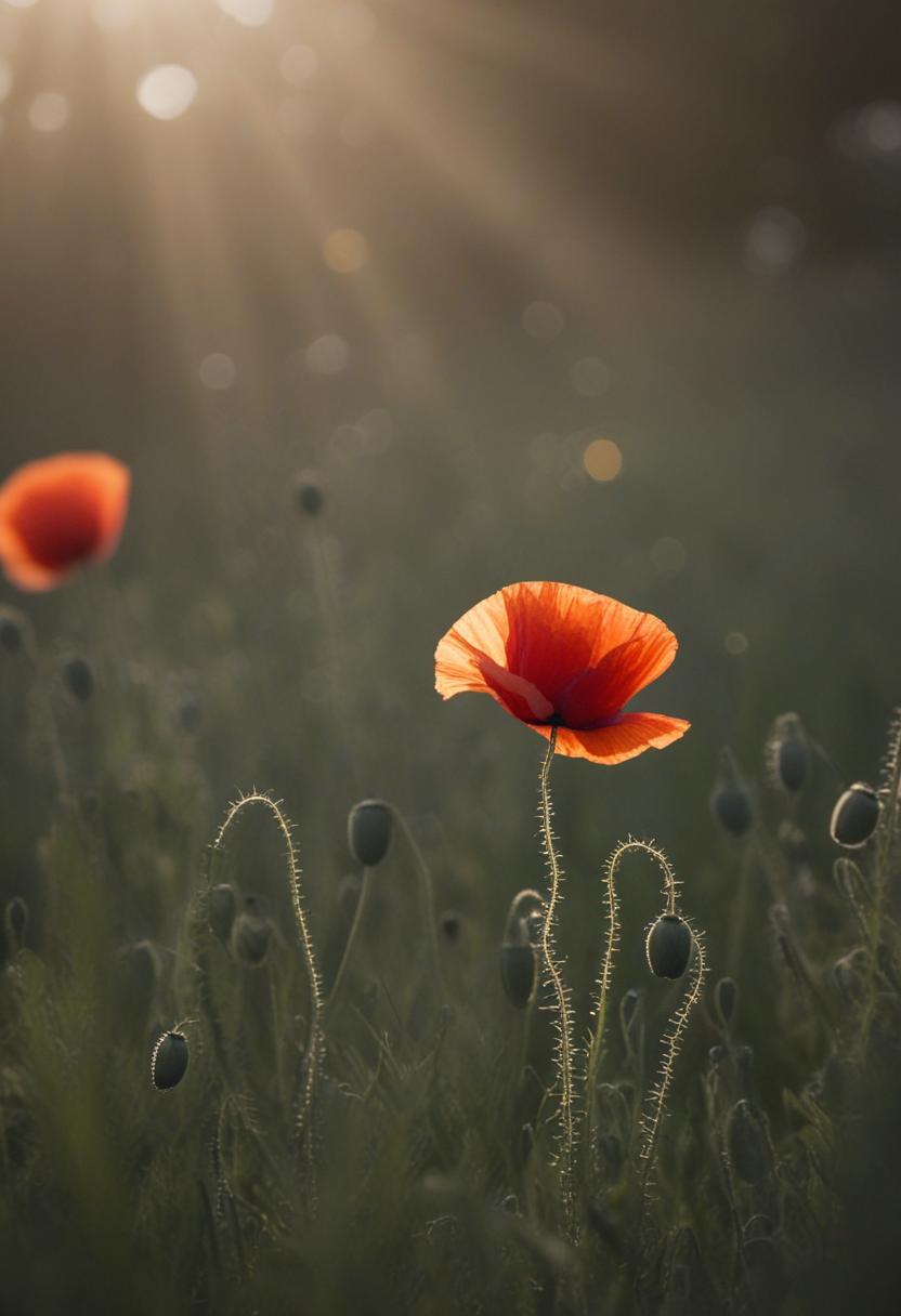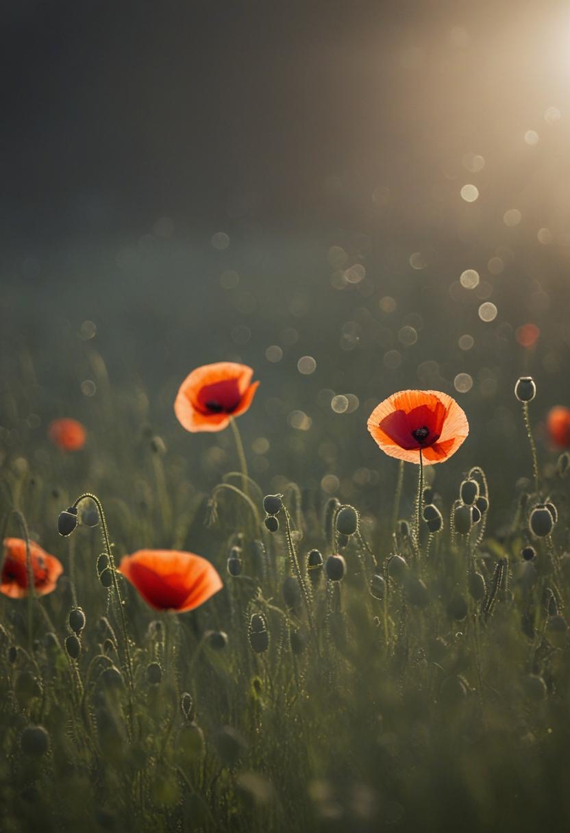 50. A serene poppy-themed image with dramatic backlighting, calm font, and a peaceful, ethereal view.